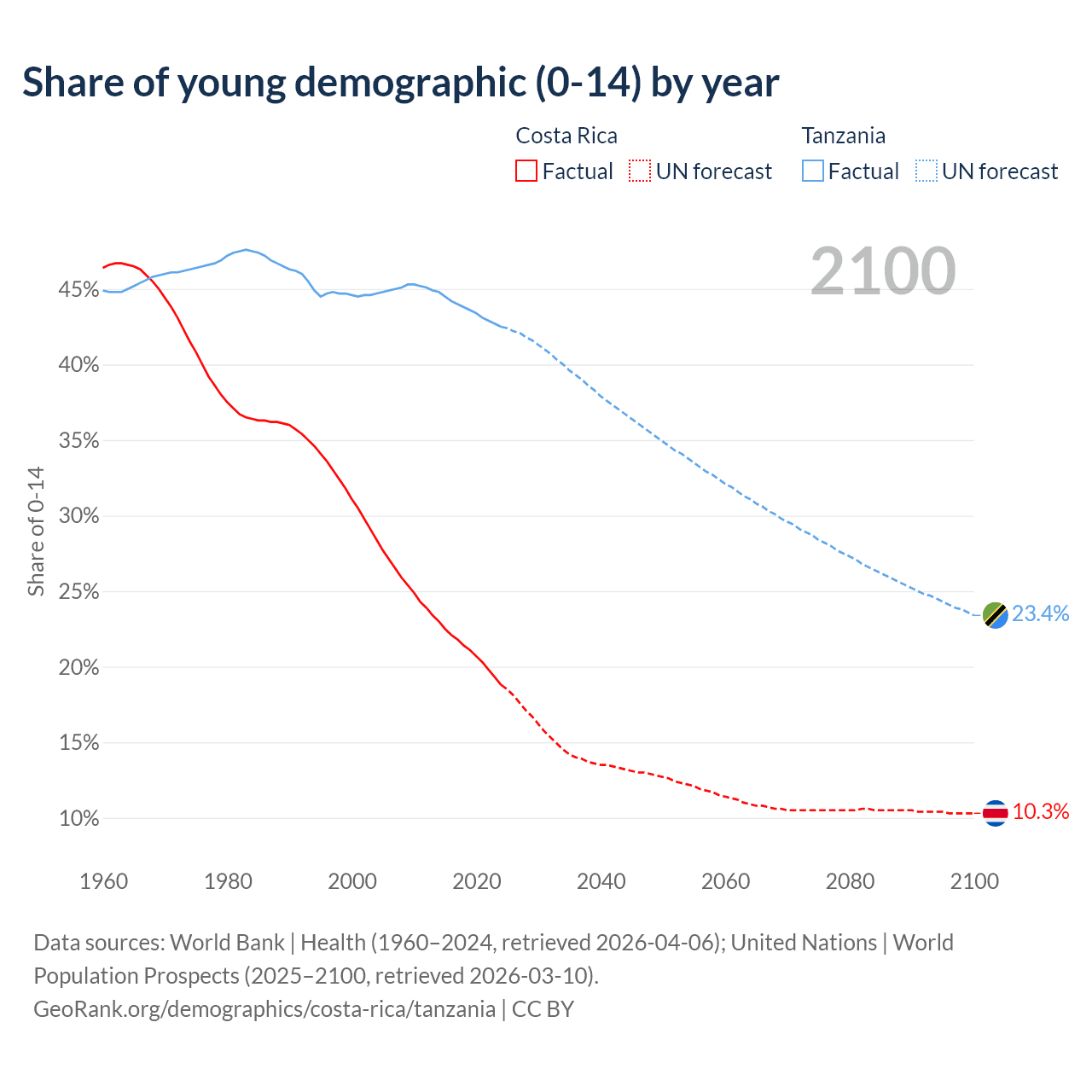 - The share of young demographic (0-15 years old) in Costa Rica is 18.8% vs 42.5% in Tanzania.