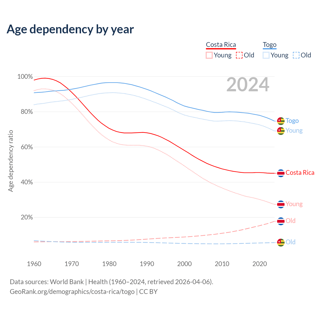- The share of young demographic (0-15 years old) in Costa Rica is 18.8% vs 39.5% in Togo.