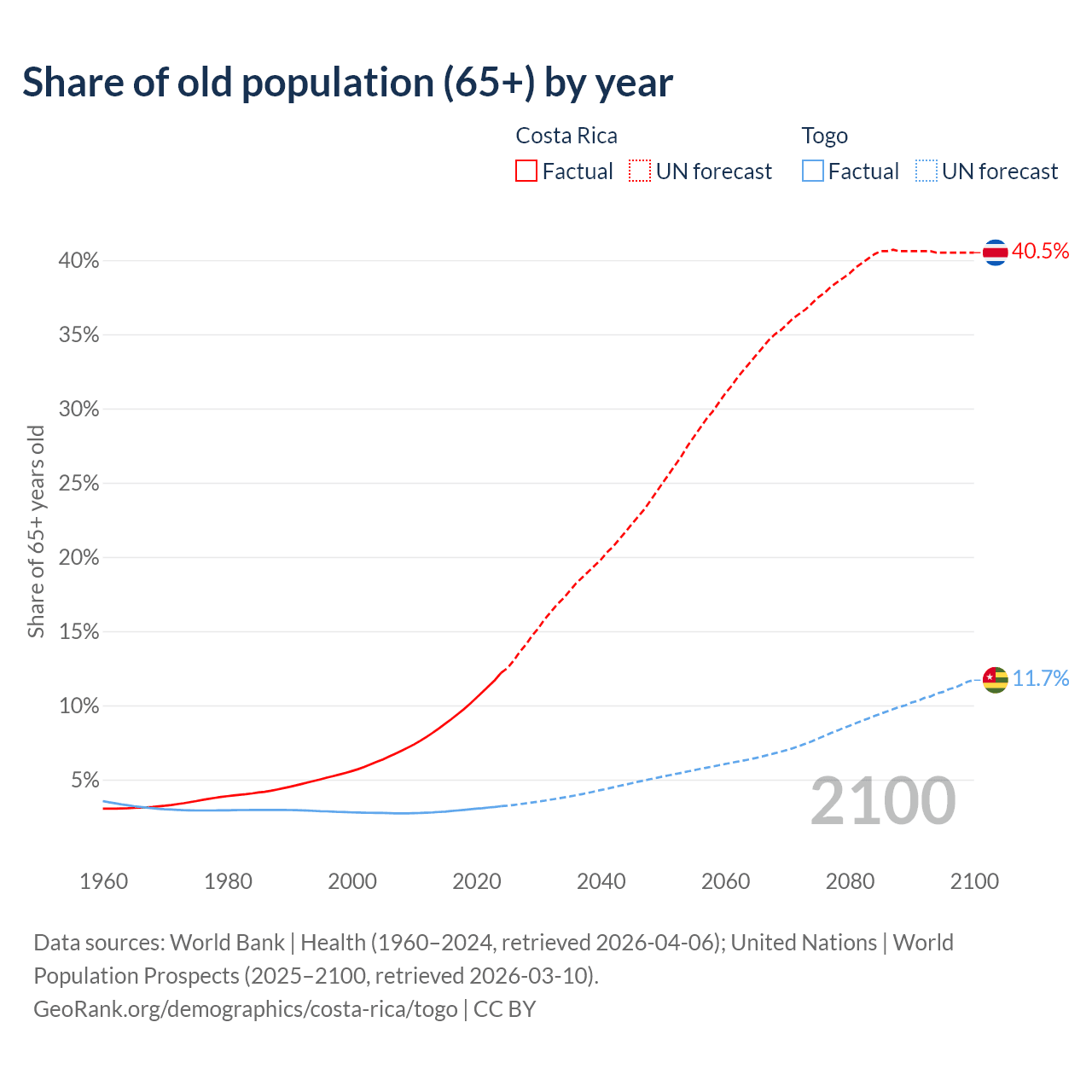 The share of older people aged 65 and over is 12.2% in Costa Rica and 3.21% in Togo. Life expectancy in Costa Rica compared to Togo .