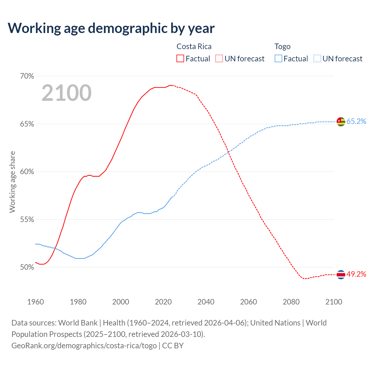- Costa Rica has 3.57M working age adults (aged 15-64) vs 5.72M in Togo.