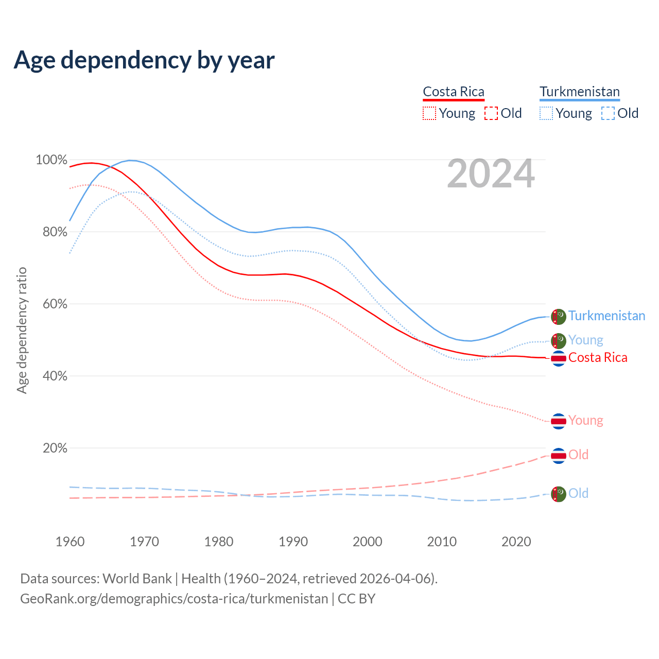 Data sources: World Bank | Health (1960–2024, retrieved 2026-04-06); U.S. Census Bureau (1960–2024, retrieved 2026-02-08).
