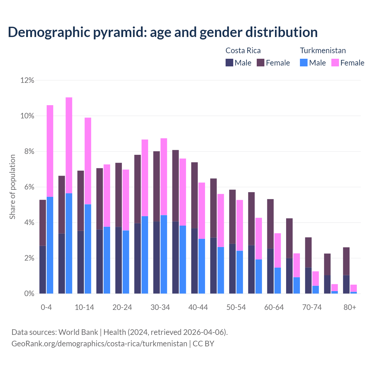 - The share of old-age demographic (65+) in Costa Rica is 12.2% vs 4.53% in Turkmenistan.
