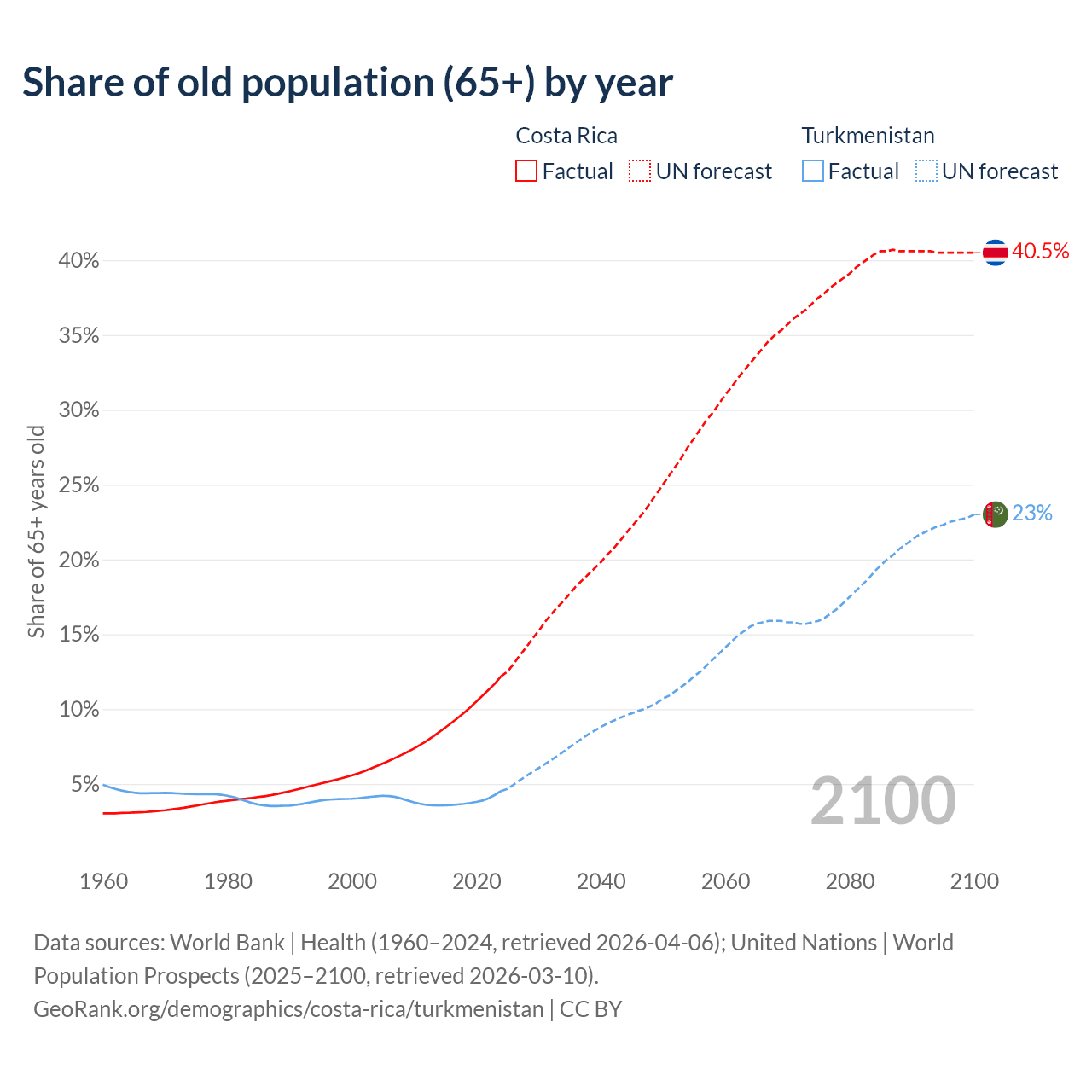 The share of older people aged 65 and over is 12.2% in Costa Rica and 4.53% in Turkmenistan. Life expectancy in Costa Rica compared to Turkmenistan .