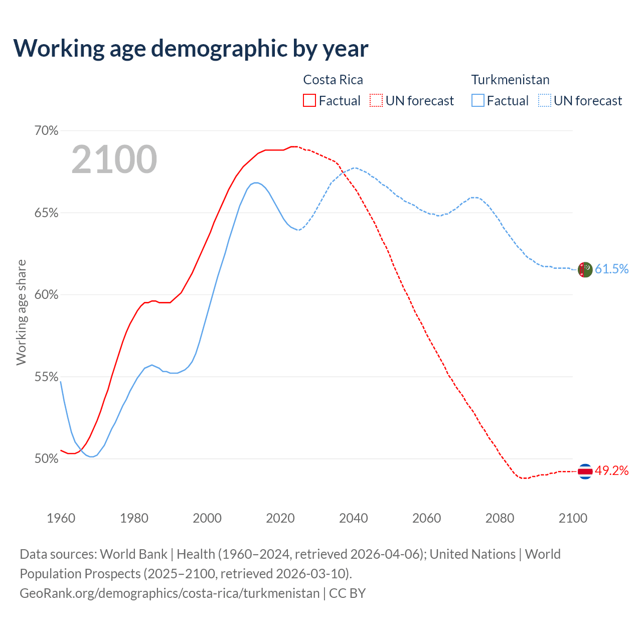 Median age Costa Rica vs Turkmenistan, 1960-2100