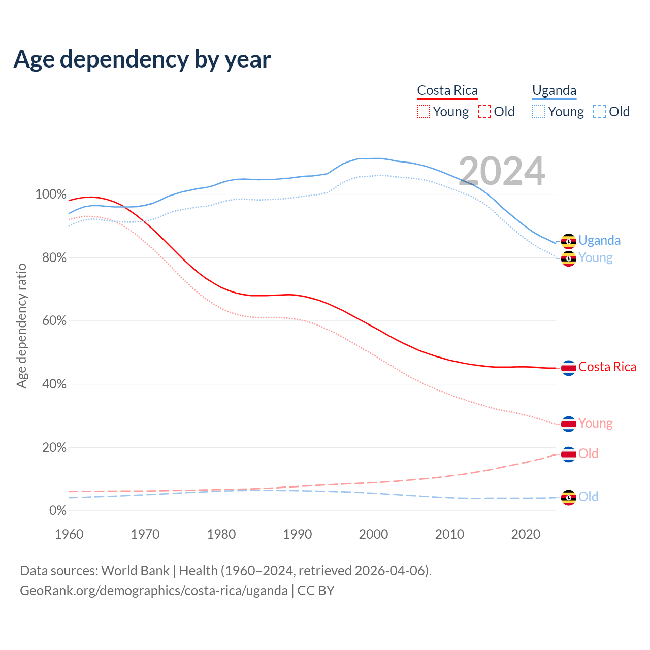 - Costa Rica is ranked 72/196 by median age (oldest to youngest) vs 187/196 for Uganda.