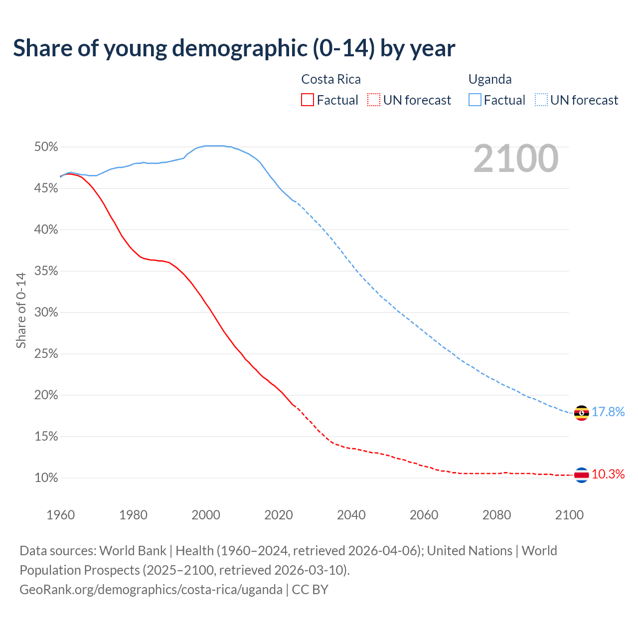 - The share of young demographic (0-15 years old) in Costa Rica is 18.8% vs 43.5% in Uganda.