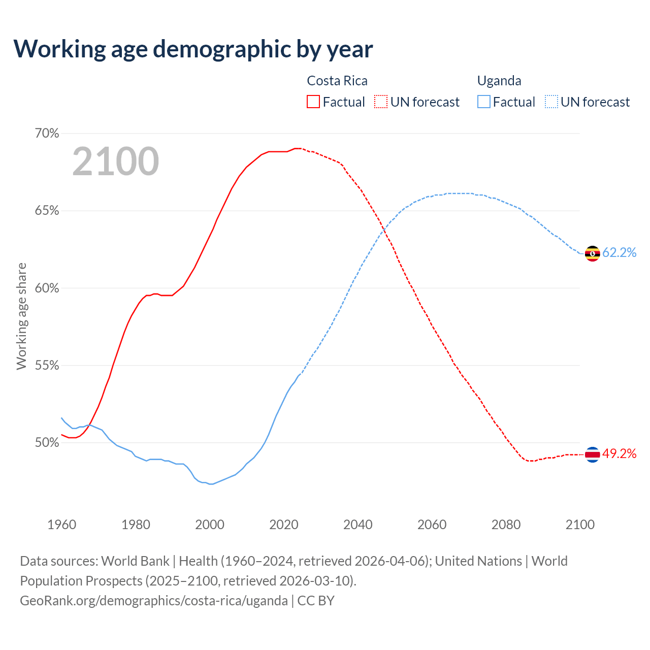 Median age Costa Rica vs Uganda, 1960-2100