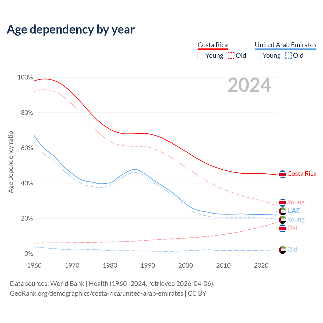 - Costa Rica is ranked 72/196 by median age (oldest to youngest) vs 91/196 for the United Arab Emirates.