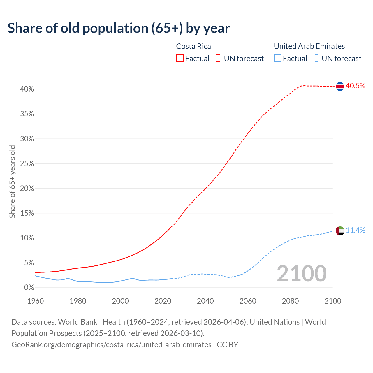 - The share of old-age demographic (65+) in Costa Rica is 12.2% vs 1.77% in the United Arab Emirates.