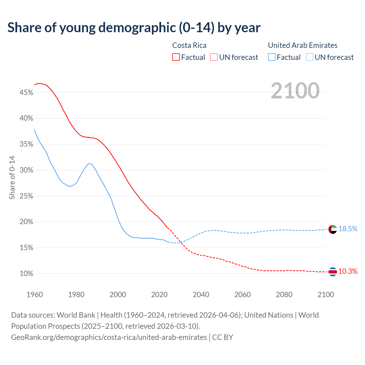 - The share of young demographic (0-15 years old) in Costa Rica is 18.8% vs 16.1% in the United Arab Emirates.
