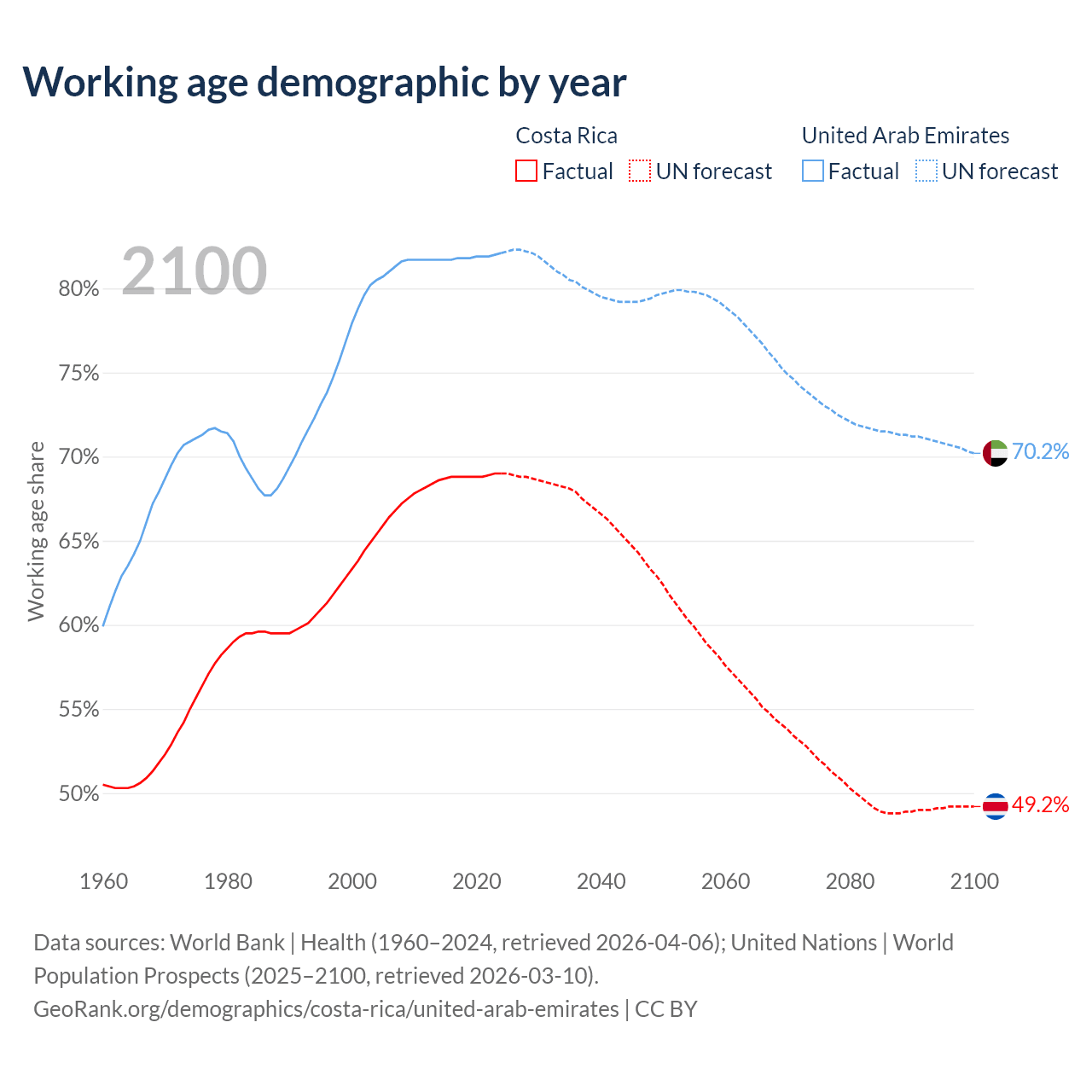 - Costa Rica has 3.57M working age adults (aged 15-64) vs 9.6M in the United Arab Emirates.