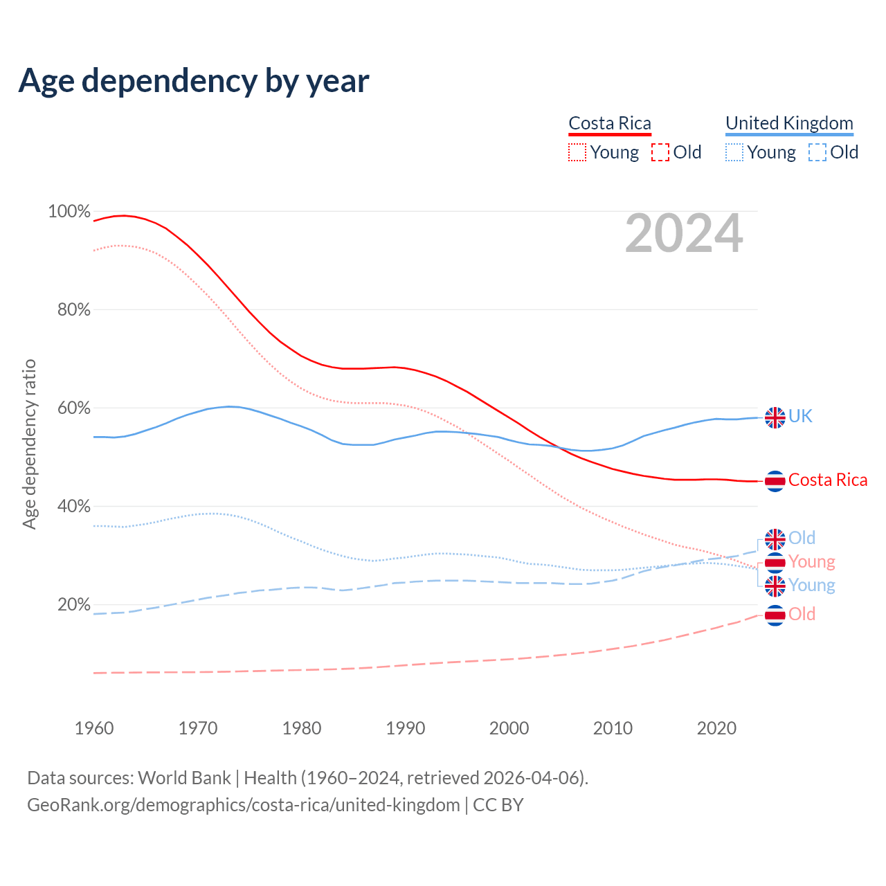 Data sources: World Bank | Health (1960–2024, retrieved 2026-04-06); U.S. Census Bureau (1960–2024, retrieved 2026-02-08).