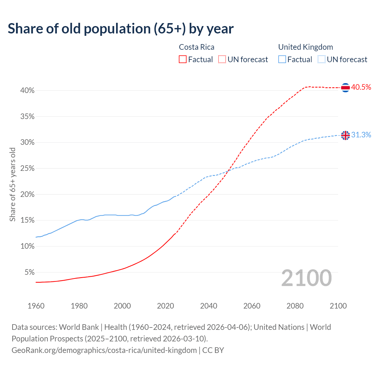 The share of older people aged 65 and over is 12.2% in Costa Rica and 19.5% in the United Kingdom. Life expectancy in Costa Rica compared to the United Kingdom .