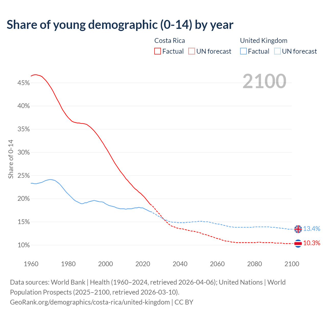 - The share of young demographic (0-15 years old) in Costa Rica is 18.8% vs 17.2% in the United Kingdom.