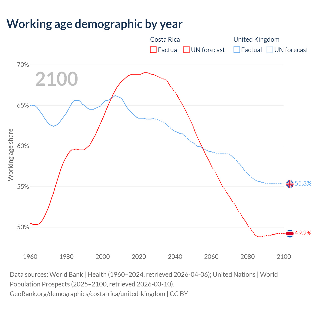 Median age Costa Rica vs United Kingdom, 1960-2100