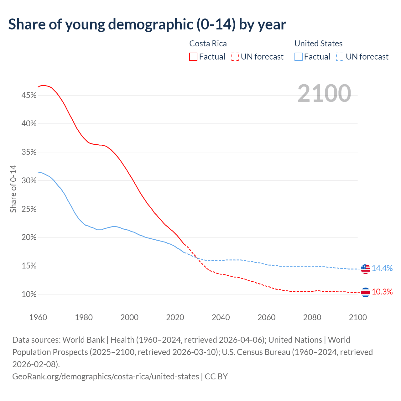 - The share of young demographic (0-15 years old) in Costa Rica is 18.8% vs 17.3% in the United States.