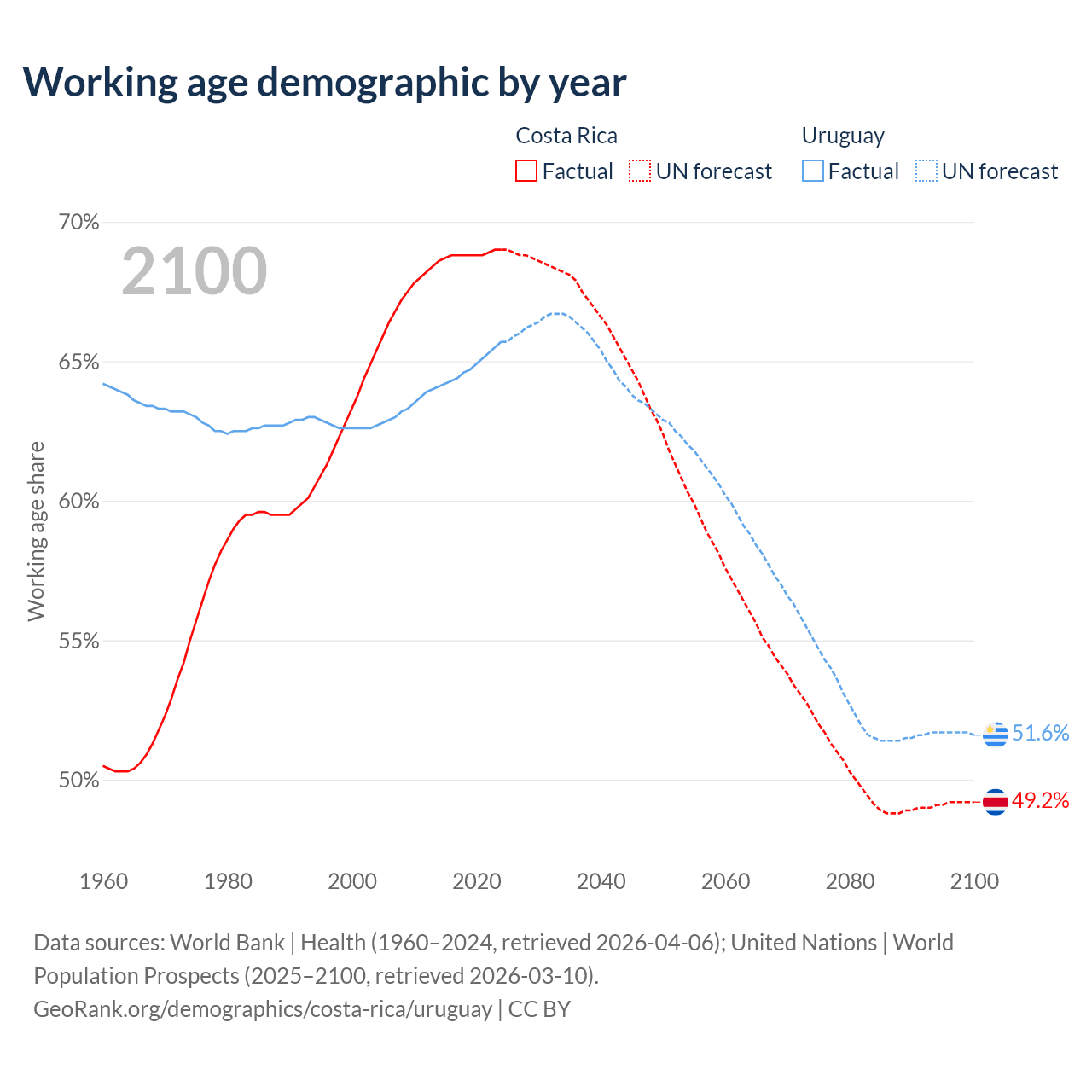 Median age Costa Rica vs Uruguay, 1960-2100