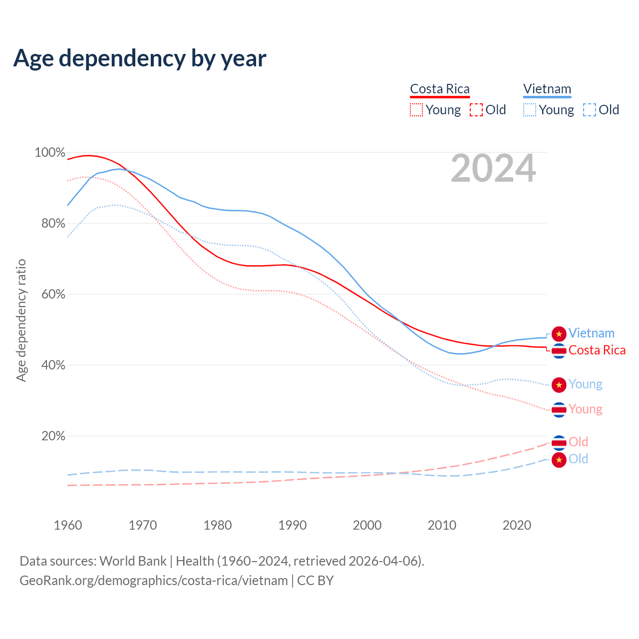 Data sources: World Bank | Health (1960–2024, retrieved 2026-04-06); U.S. Census Bureau (1960–2024, retrieved 2026-02-08).