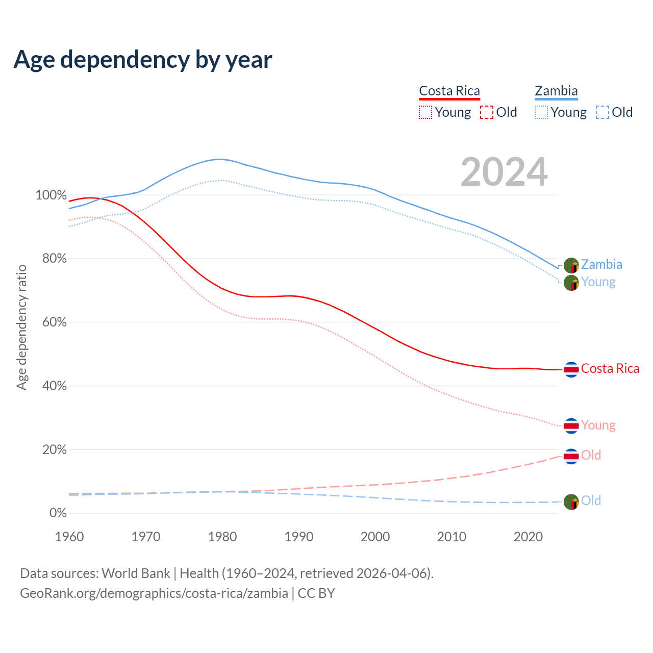 - Costa Rica is ranked 72/196 by median age (oldest to youngest) vs 182/196 for Zambia.