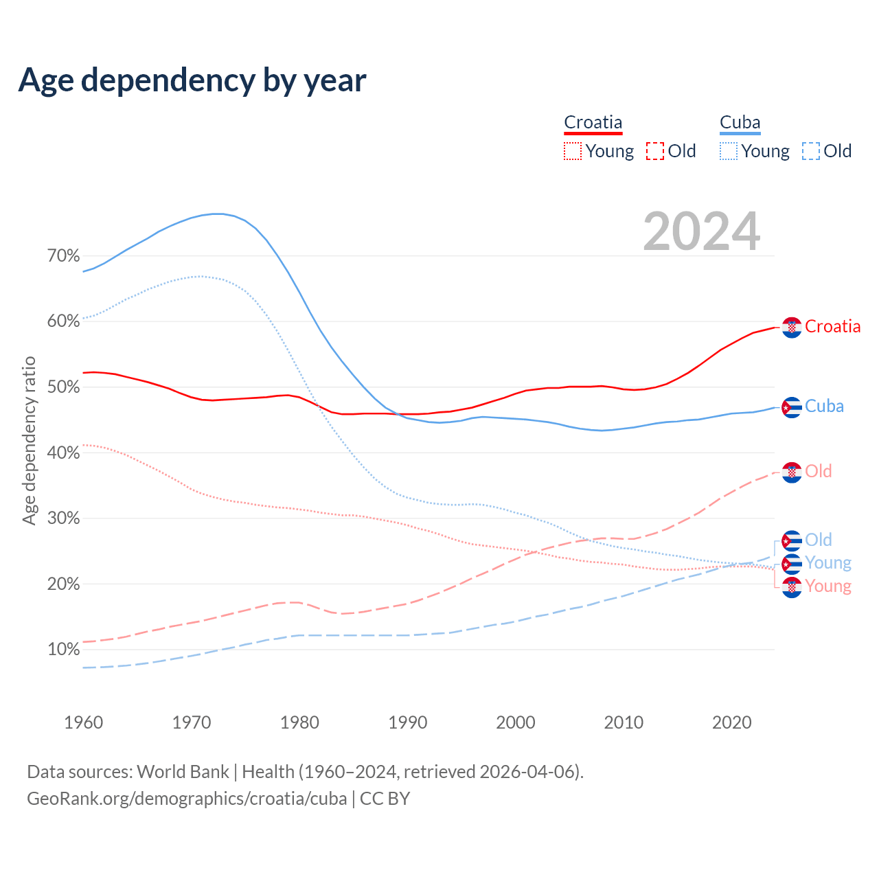 Data sources: World Bank | Health (1960–2024, retrieved 2026-04-06); U.S. Census Bureau (1960–2024, retrieved 2026-02-08).