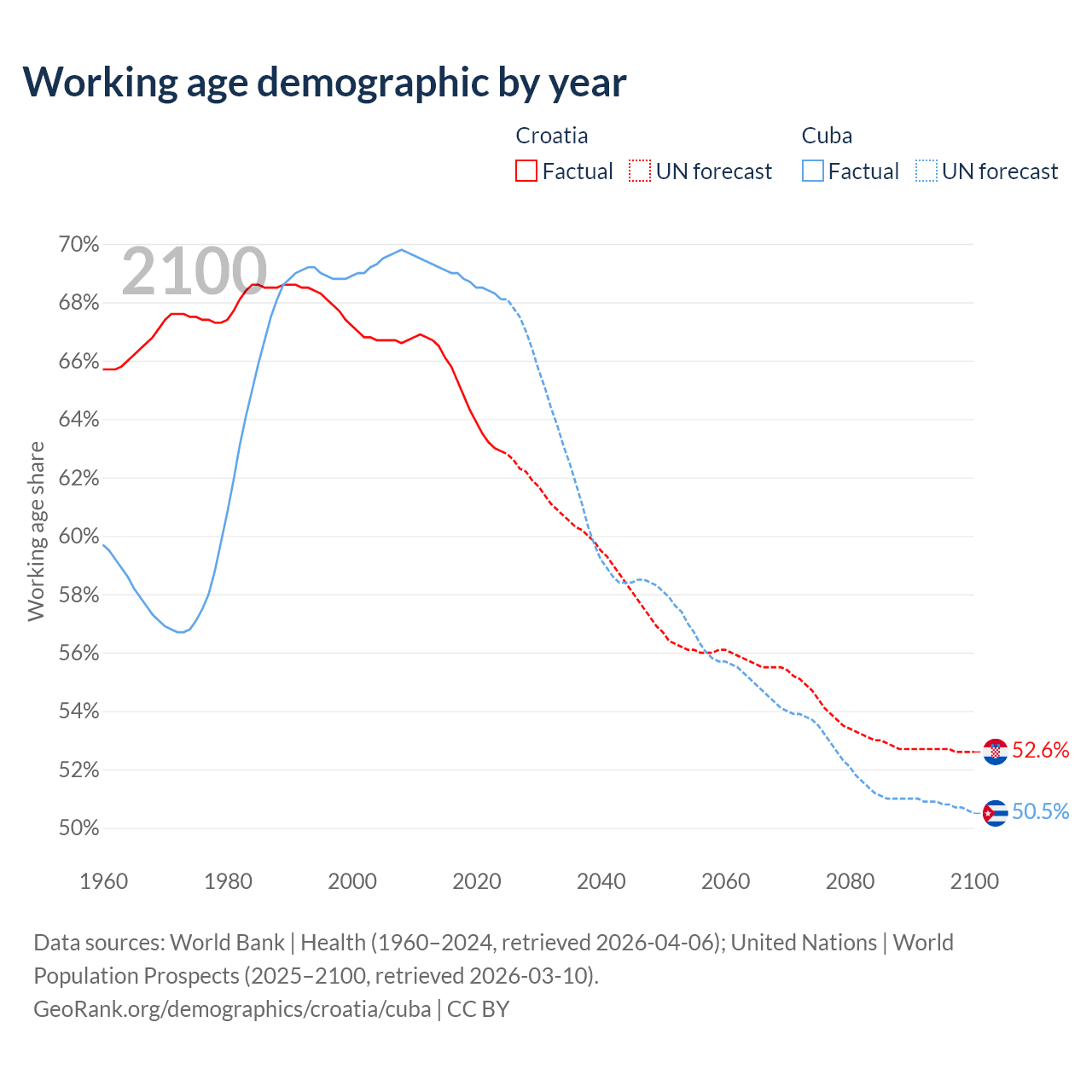 Median age Croatia vs Cuba, 1960-2100