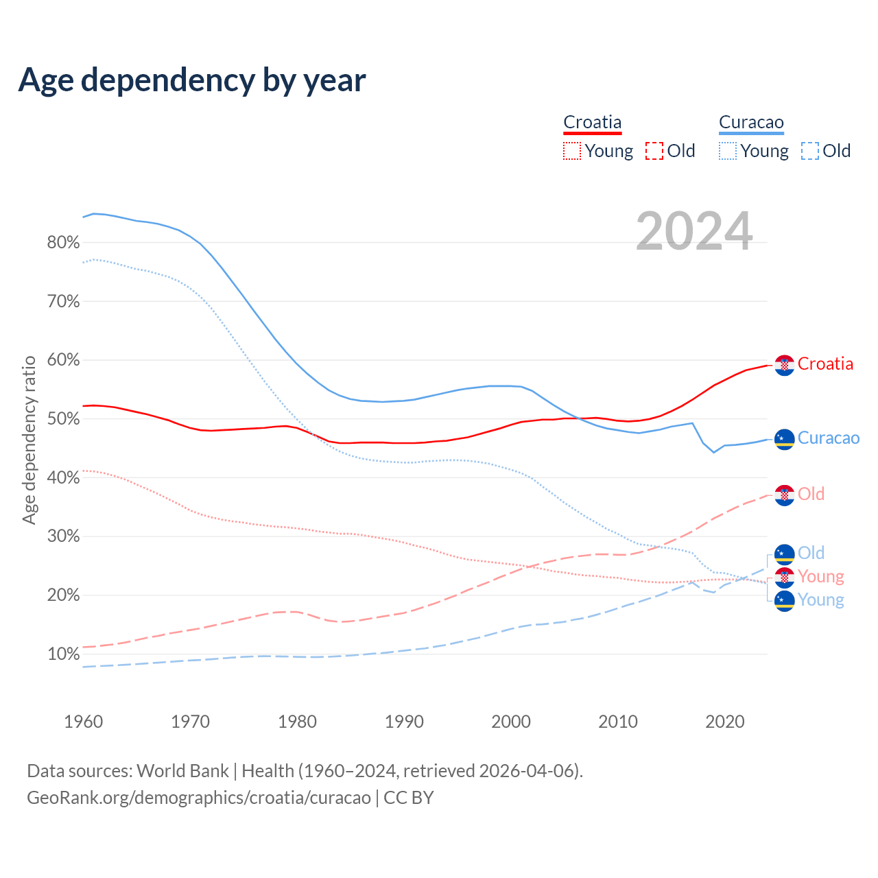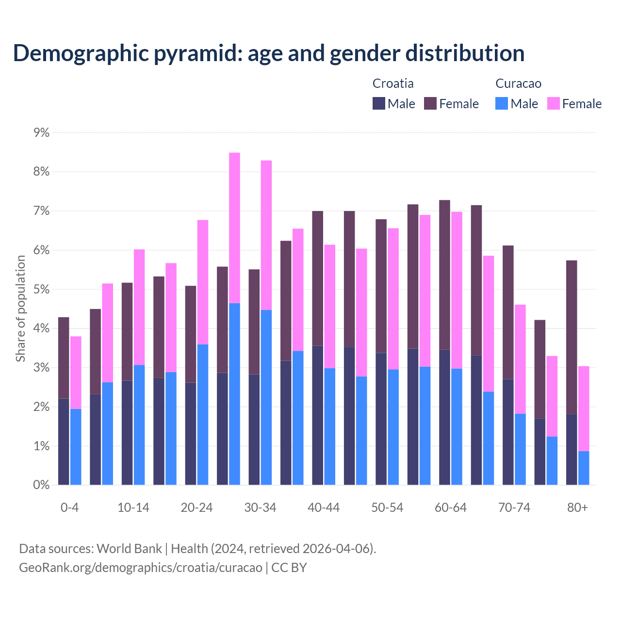 - The share of old-age demographic (65+) in Croatia is 23.2% vs 16.8% in Curacao.