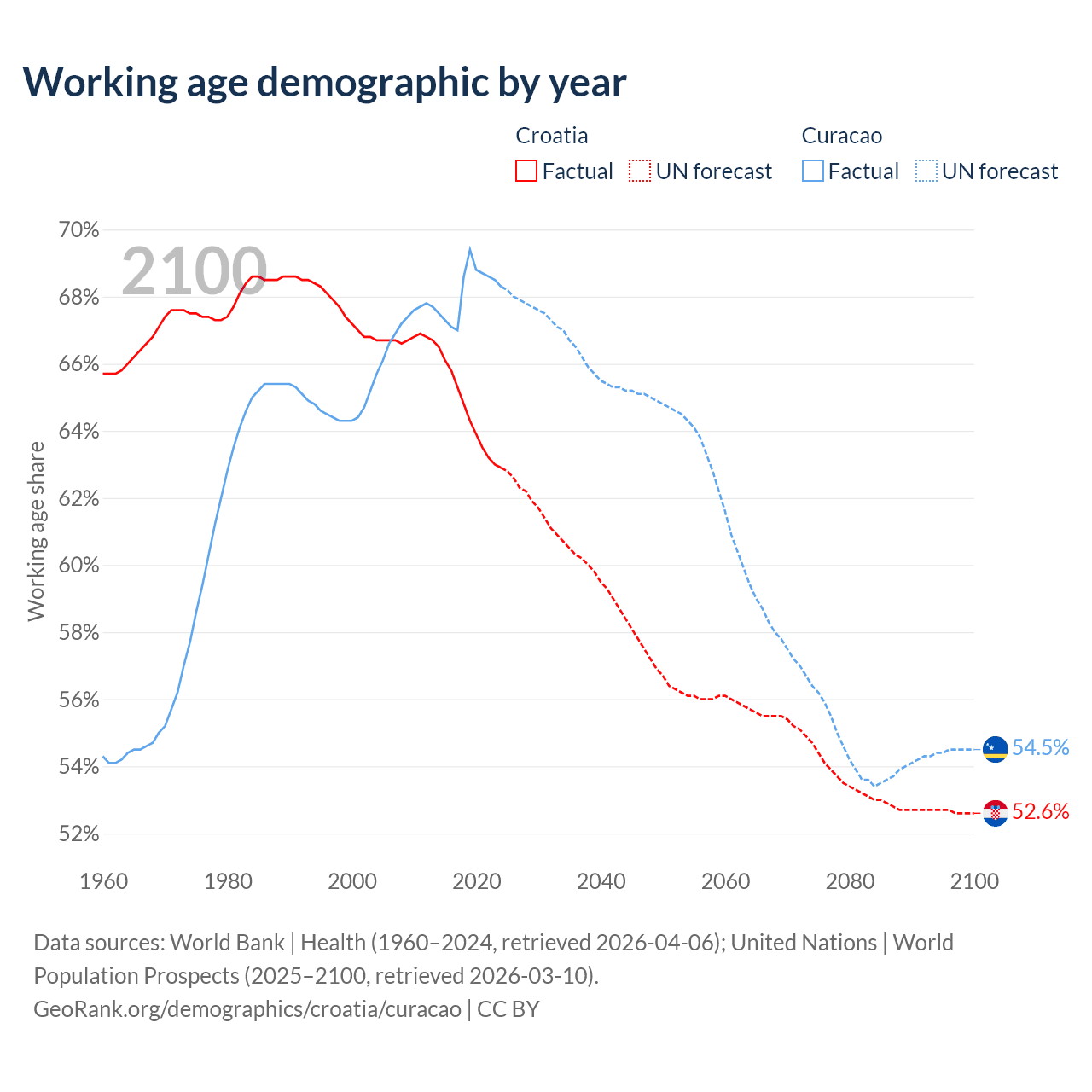 Median age Croatia vs Curacao, 1960-2100