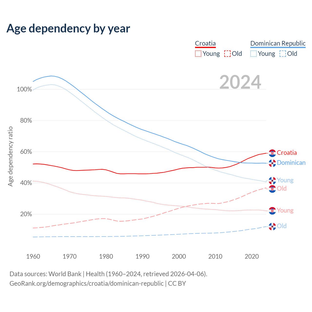 - Croatia is ranked 11/196 by median age (oldest to youngest) vs 112/196 for the Dominican Republic.