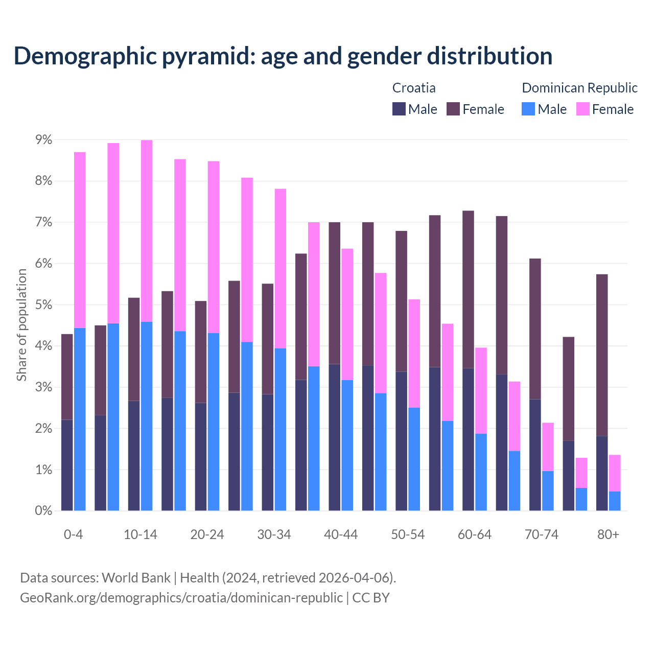 - As of 2026, the population of Croatia is 3.81M vs 11.6M in the Dominican Republic - 3.05 times difference.
