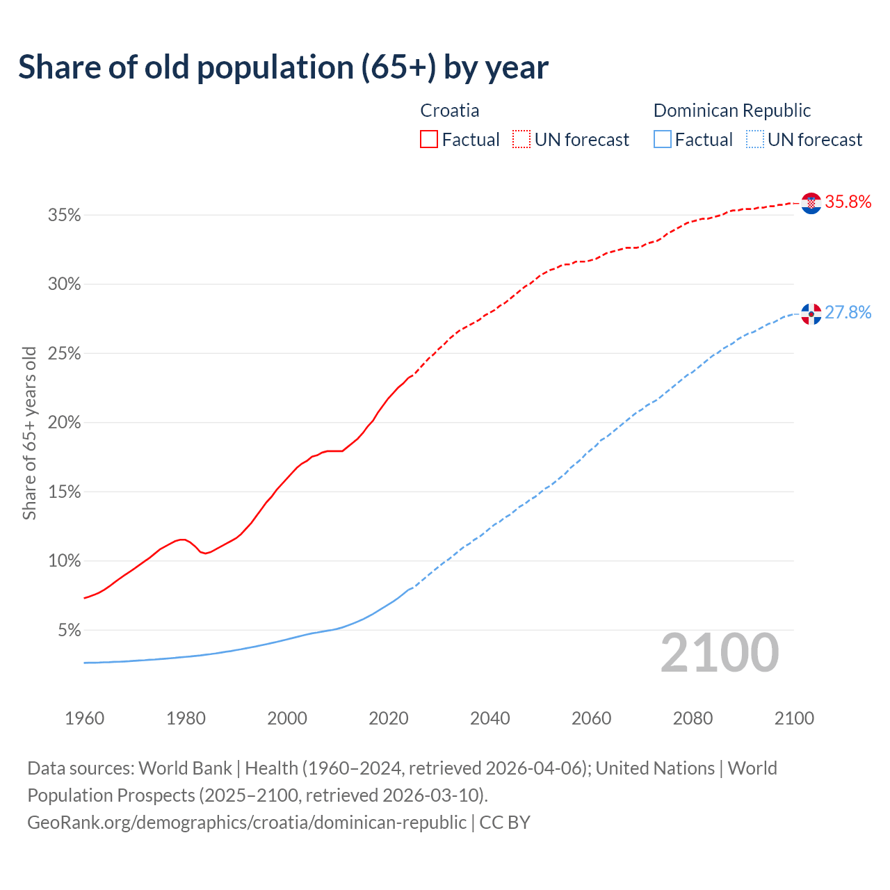 The share of older people aged 65 and over is 23.2% in Croatia and 7.88% in the Dominican Republic. Life expectancy in Croatia compared to the Dominican Republic .
