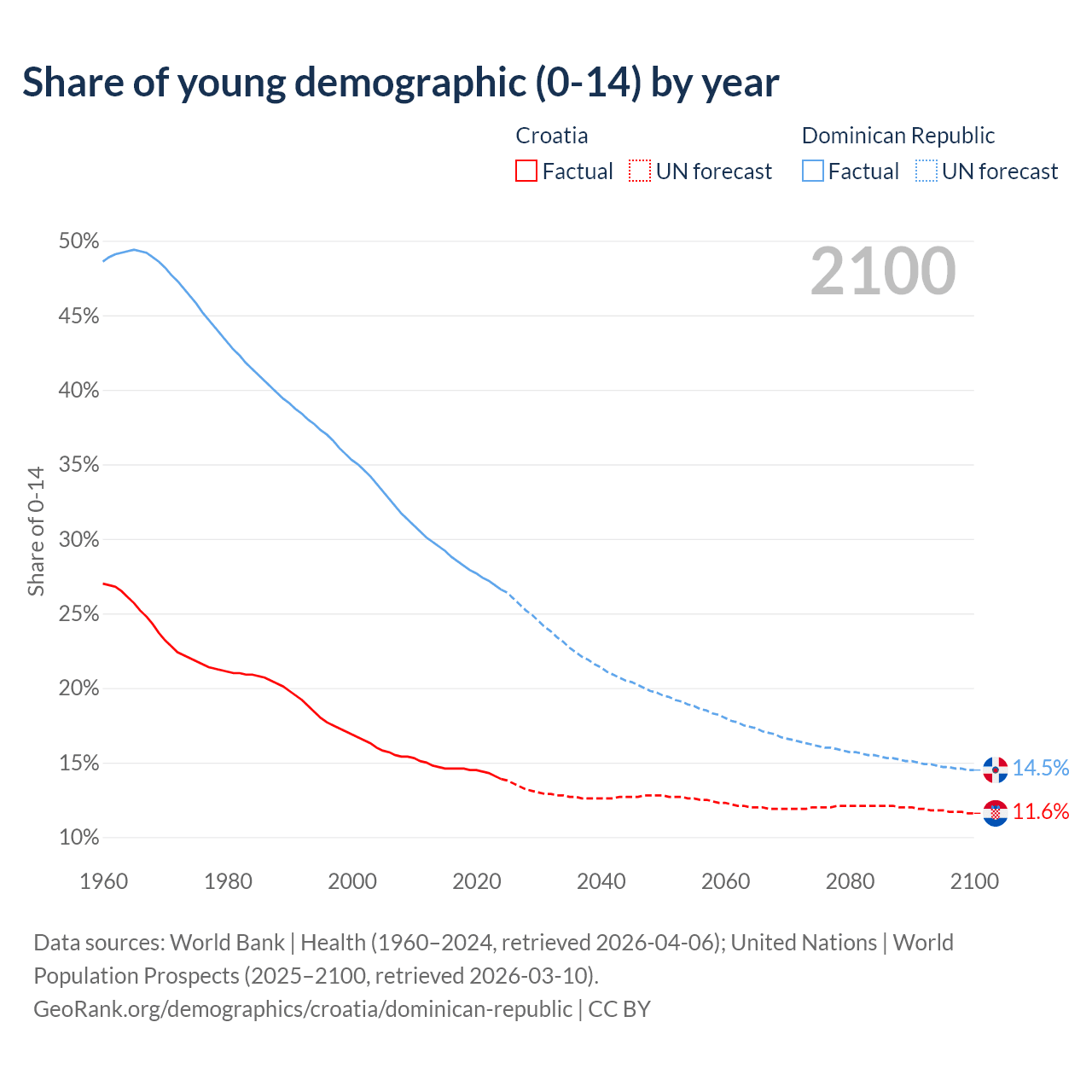 - The share of young demographic (0-15 years old) in Croatia is 13.9% vs 26.6% in the Dominican Republic.