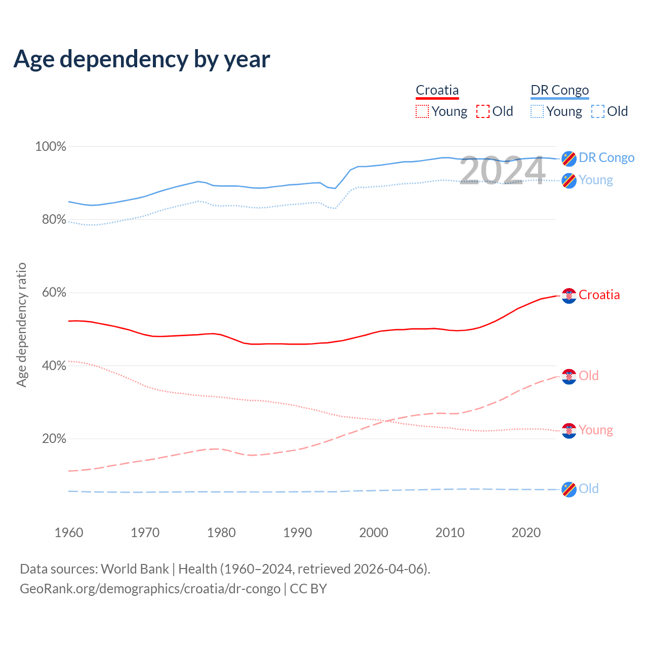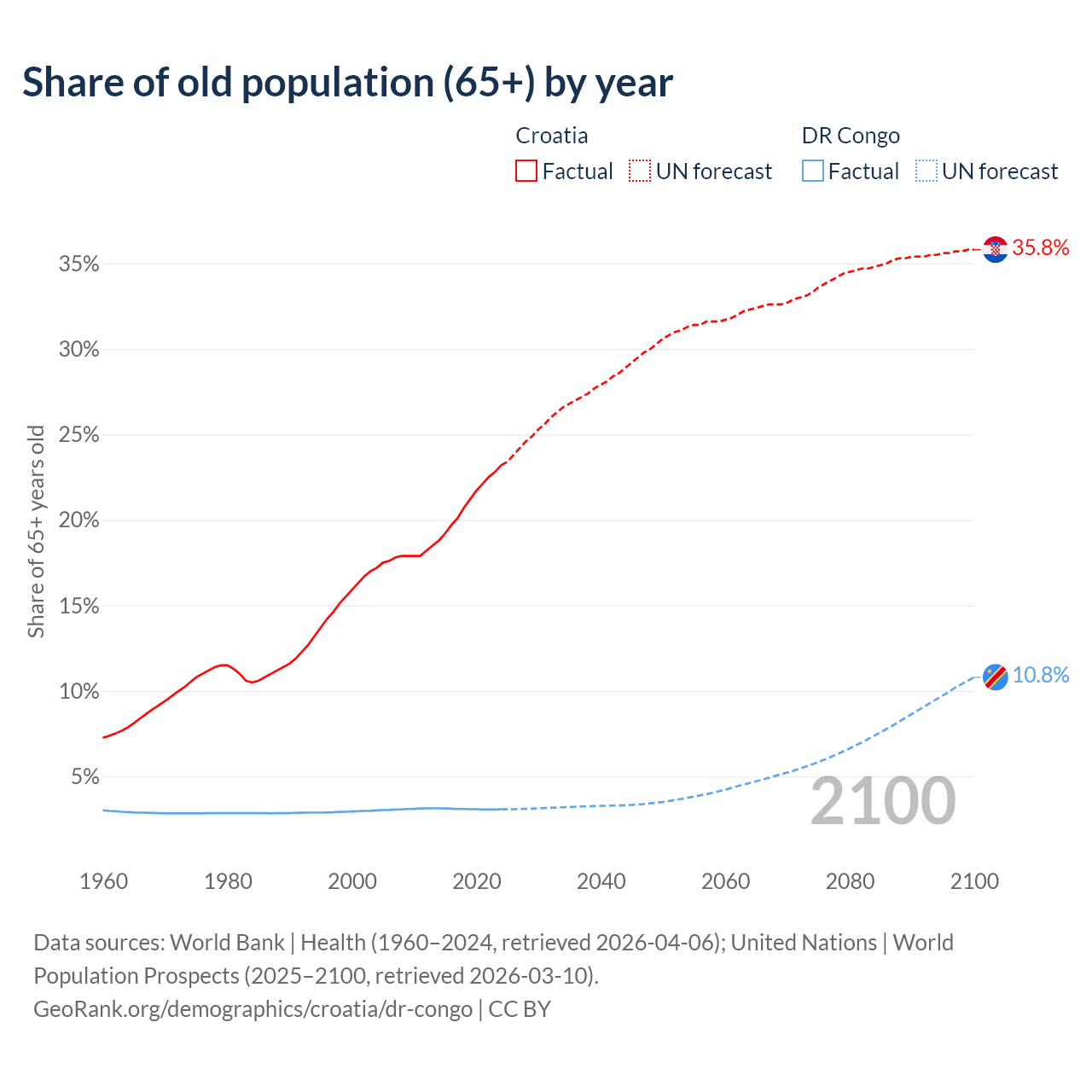 The share of older people aged 65 and over is 23.2% in Croatia and 3.08% in the DR Congo. Life expectancy in Croatia compared to the DR Congo .