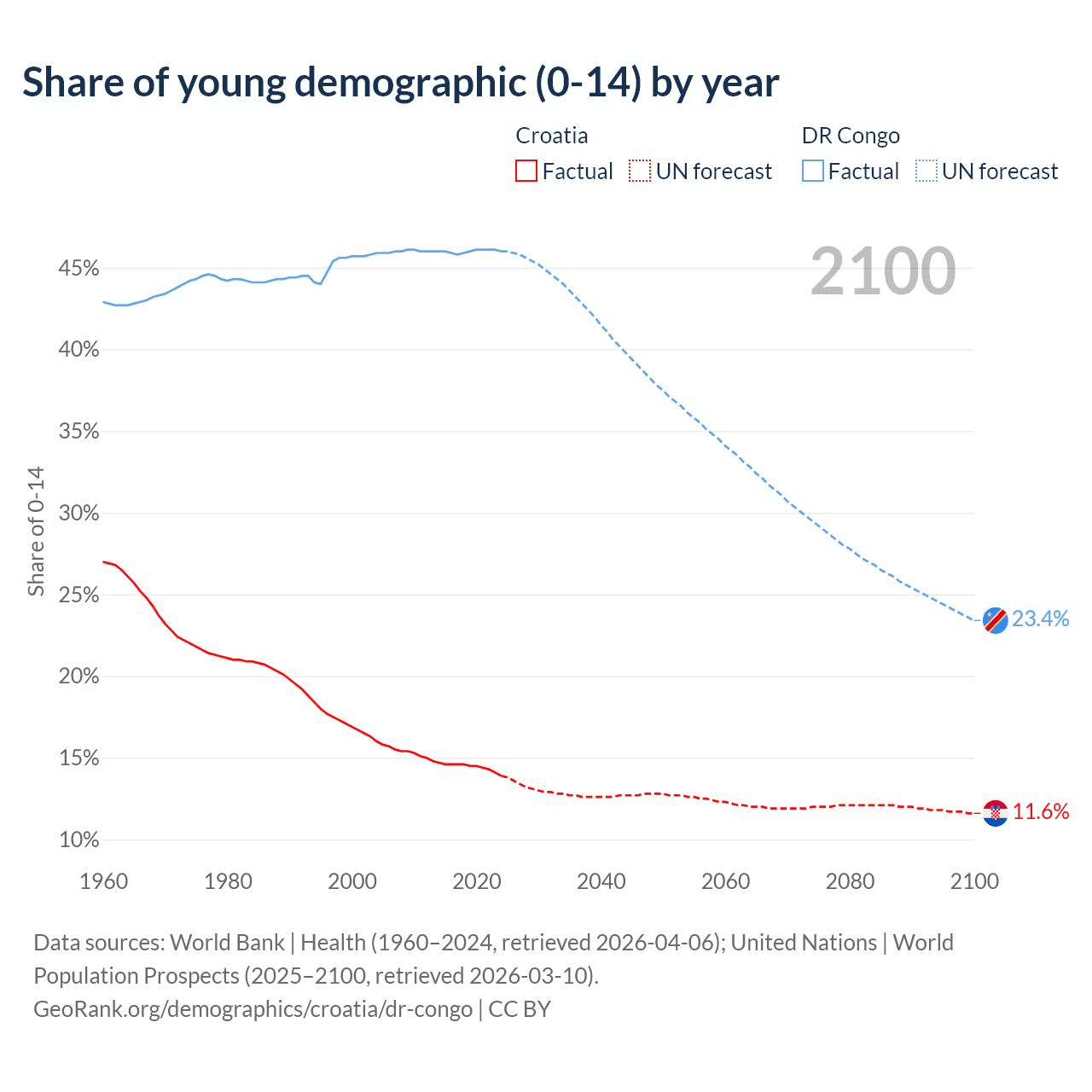 - The share of young demographic (0-15 years old) in Croatia is 13.9% vs 46% in the DR Congo.