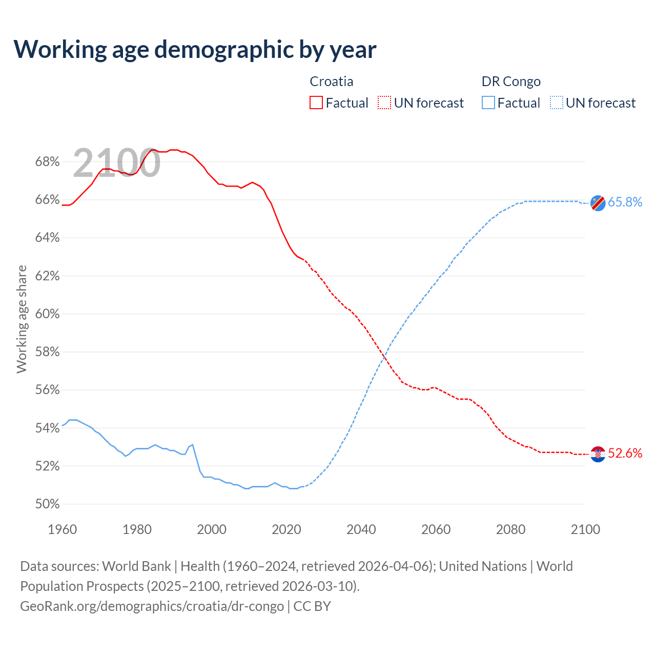 Median age Croatia vs DR Congo, 1960-2100