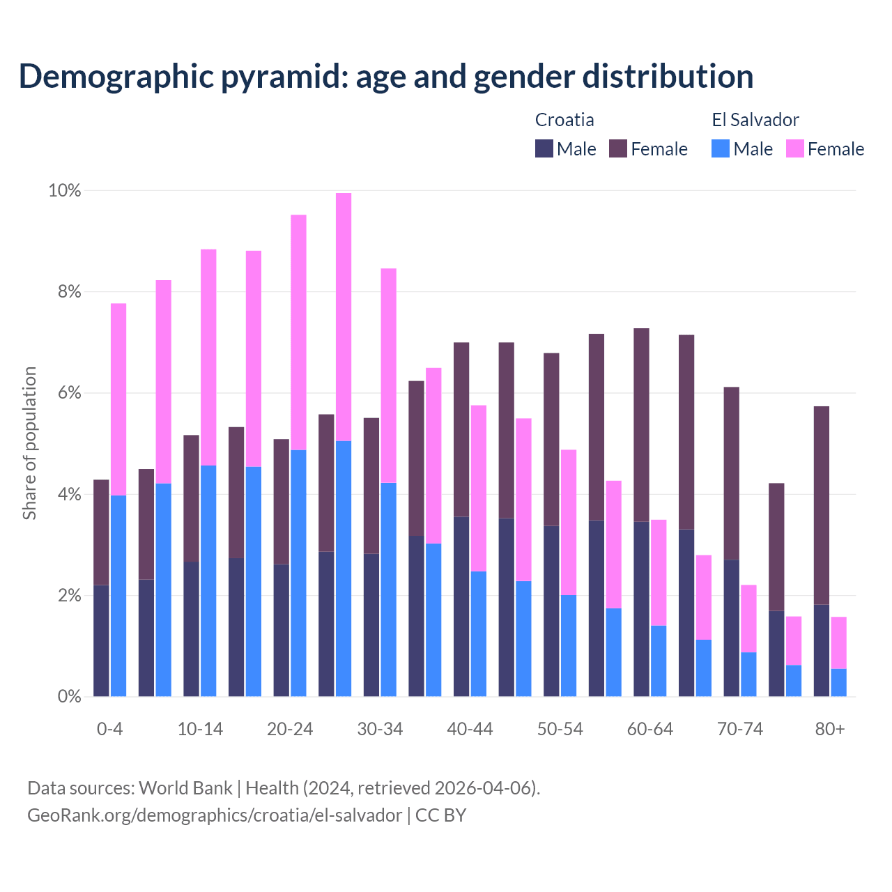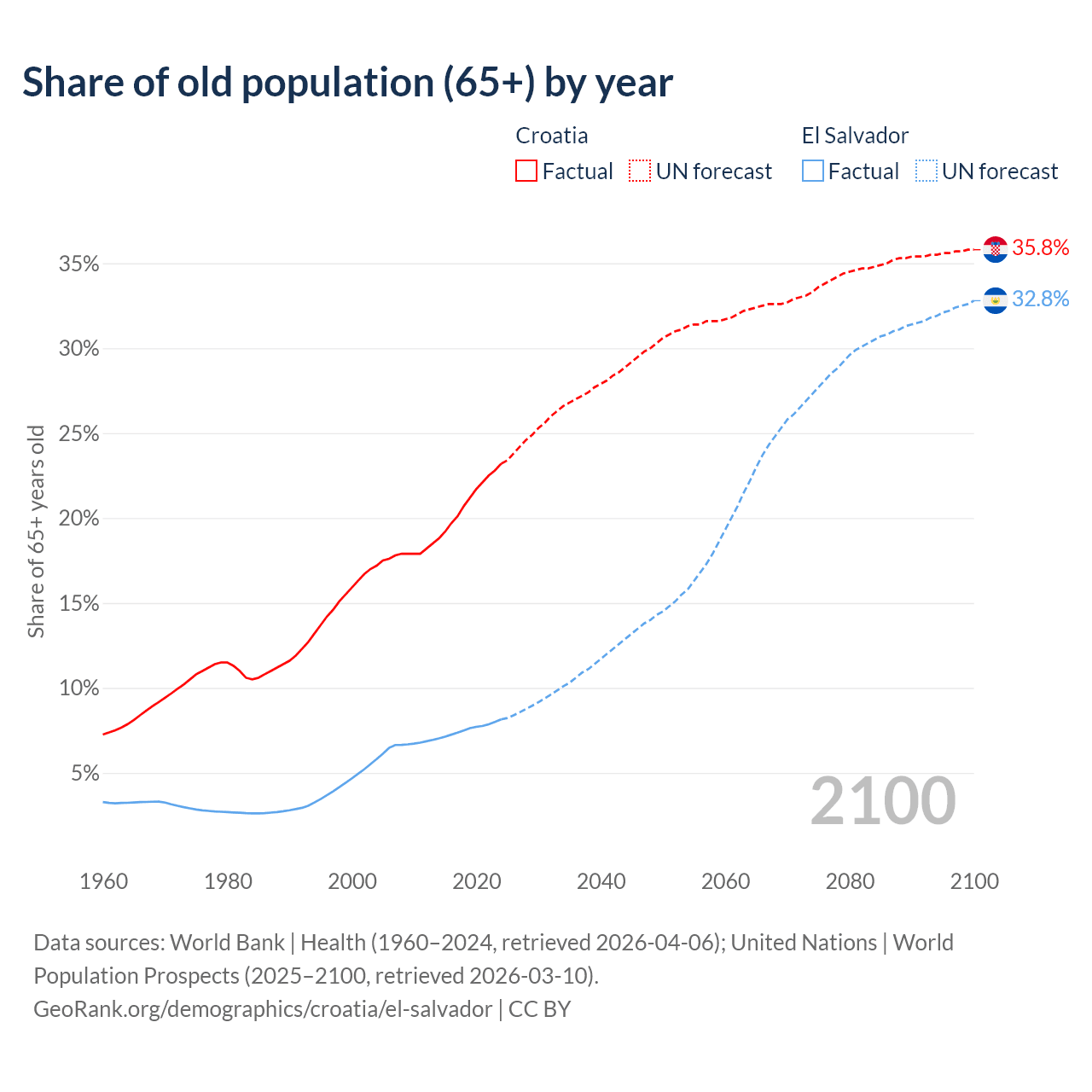 - The share of old-age demographic (65+) in Croatia is 23.2% vs 8.15% in El Salvador.