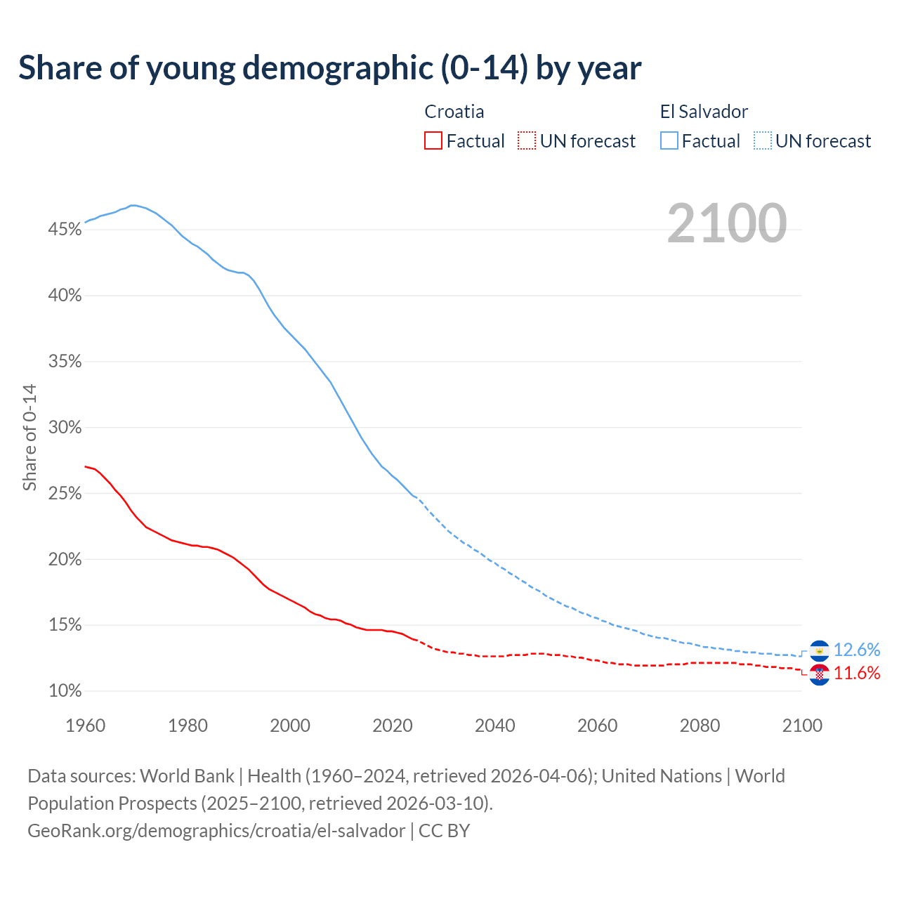 - The share of young demographic (0-15 years old) in Croatia is 13.9% vs 24.8% in El Salvador.
