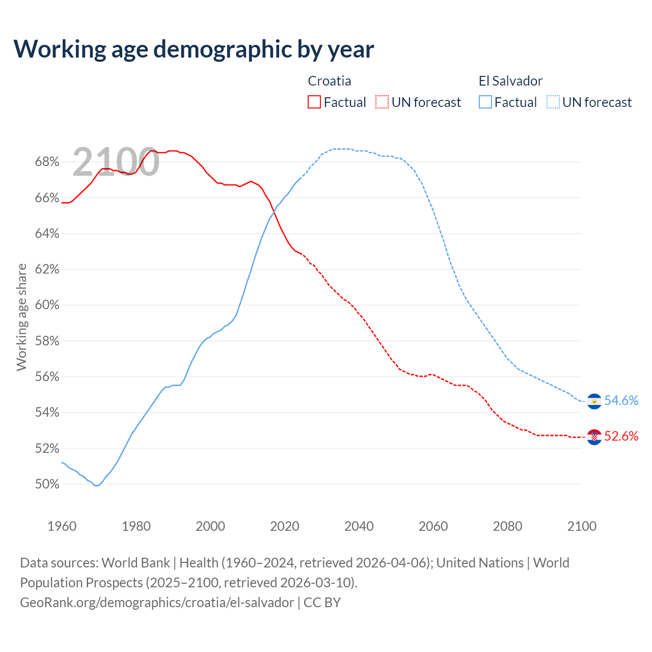 Median age Croatia vs El Salvador, 1960-2100