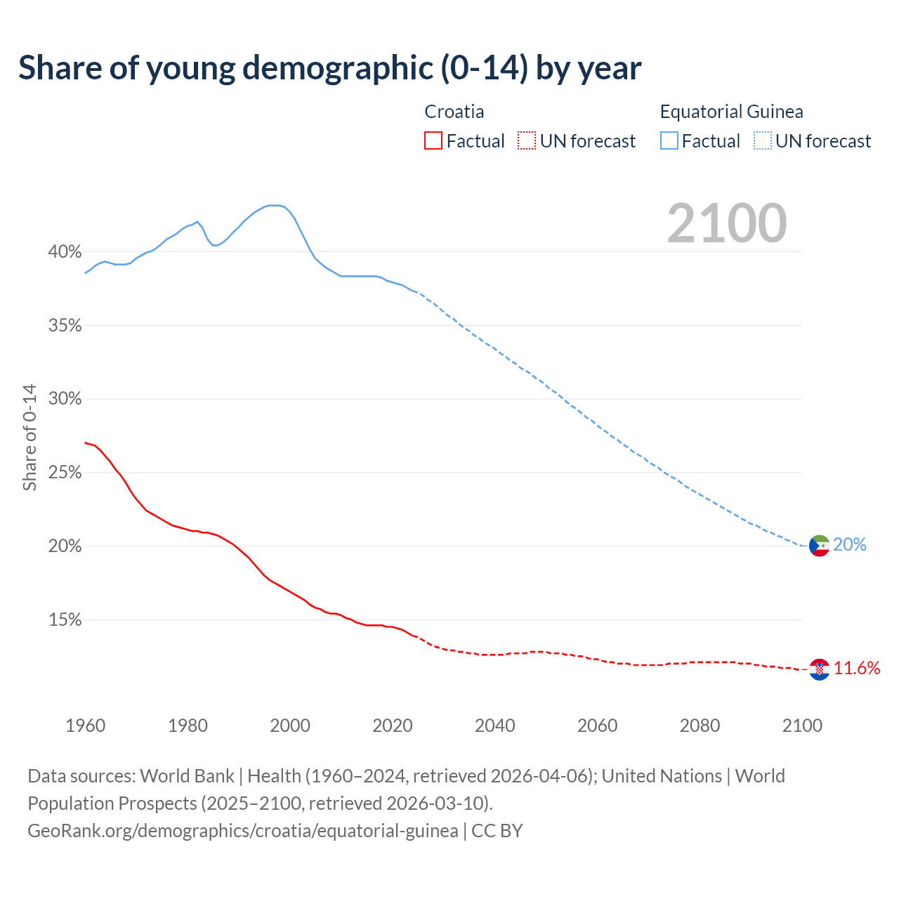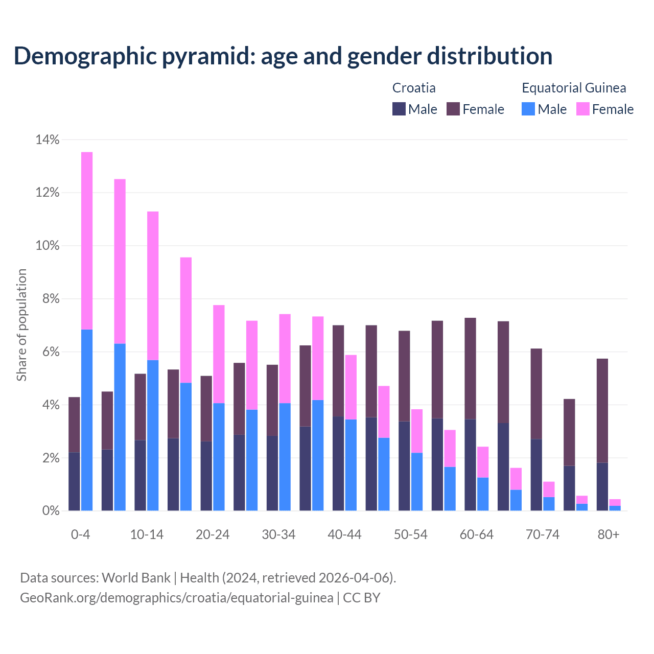 - The share of young demographic (0-15 years old) in Croatia is 13.9% vs 37.3% in Equatorial Guinea.