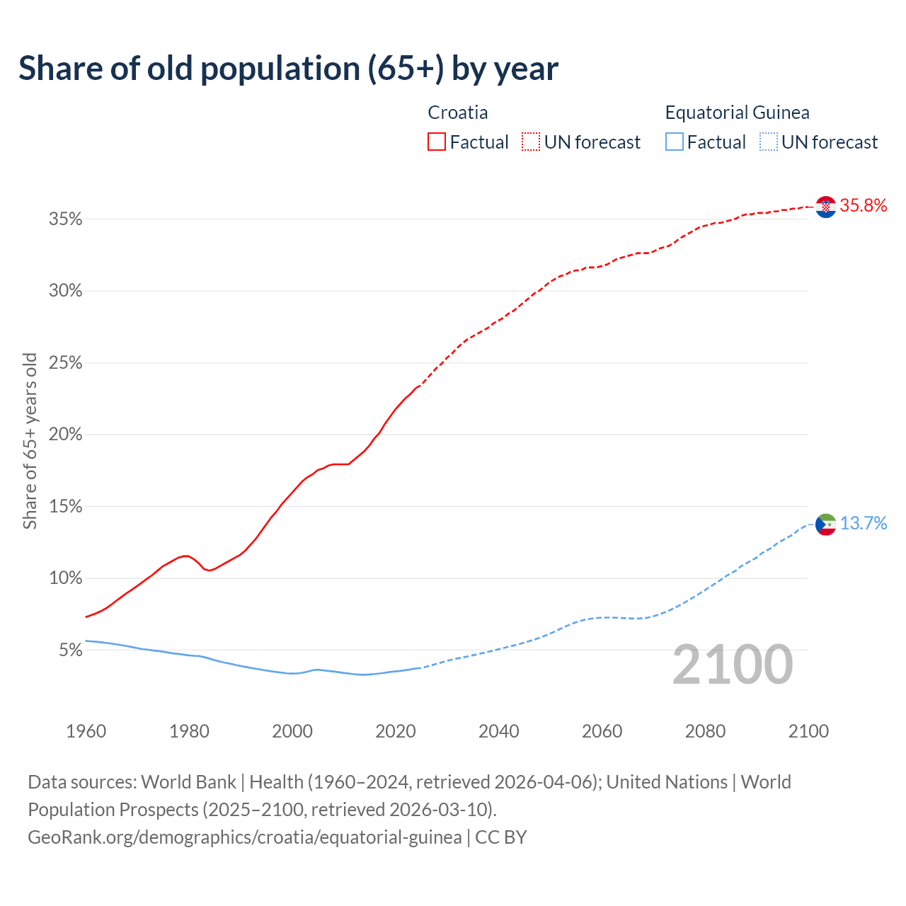 The share of older people aged 65 and over is 23.2% in Croatia and 3.69% in Equatorial Guinea. Life expectancy in Croatia compared to Equatorial Guinea .