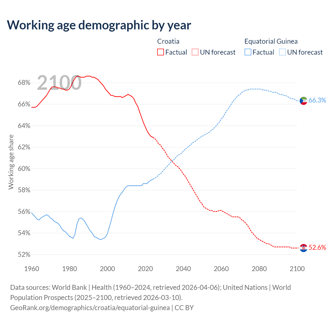 Median age Croatia vs Equatorial Guinea, 1960-2100