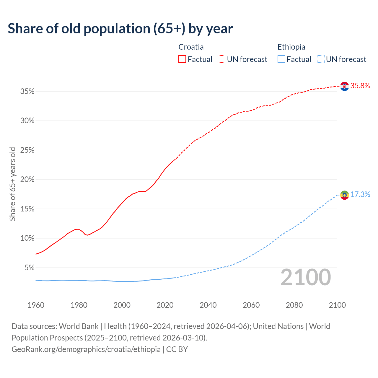 The share of older people aged 65 and over is 23.2% in Croatia and 3.23% in Ethiopia. Life expectancy in Croatia compared to Ethiopia .