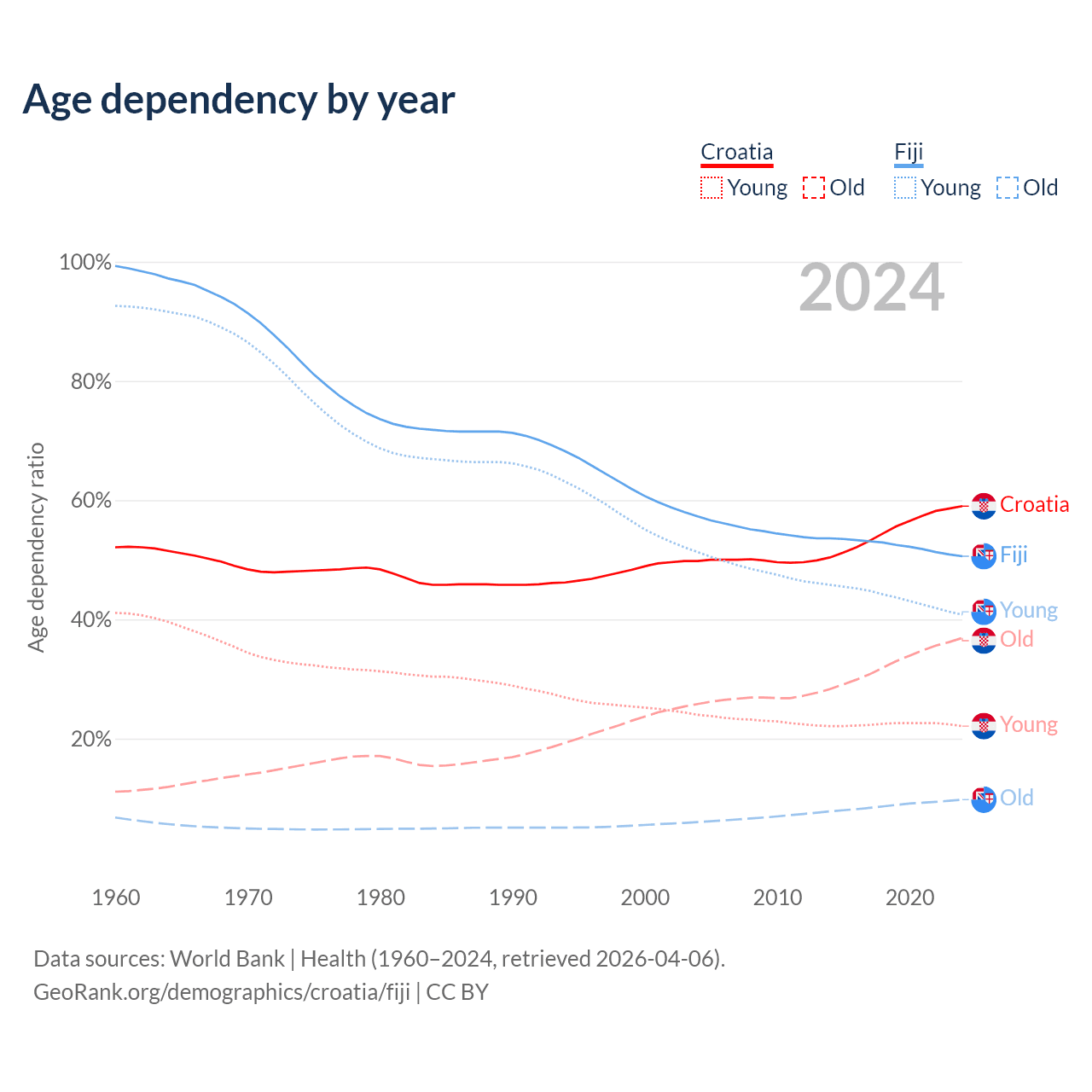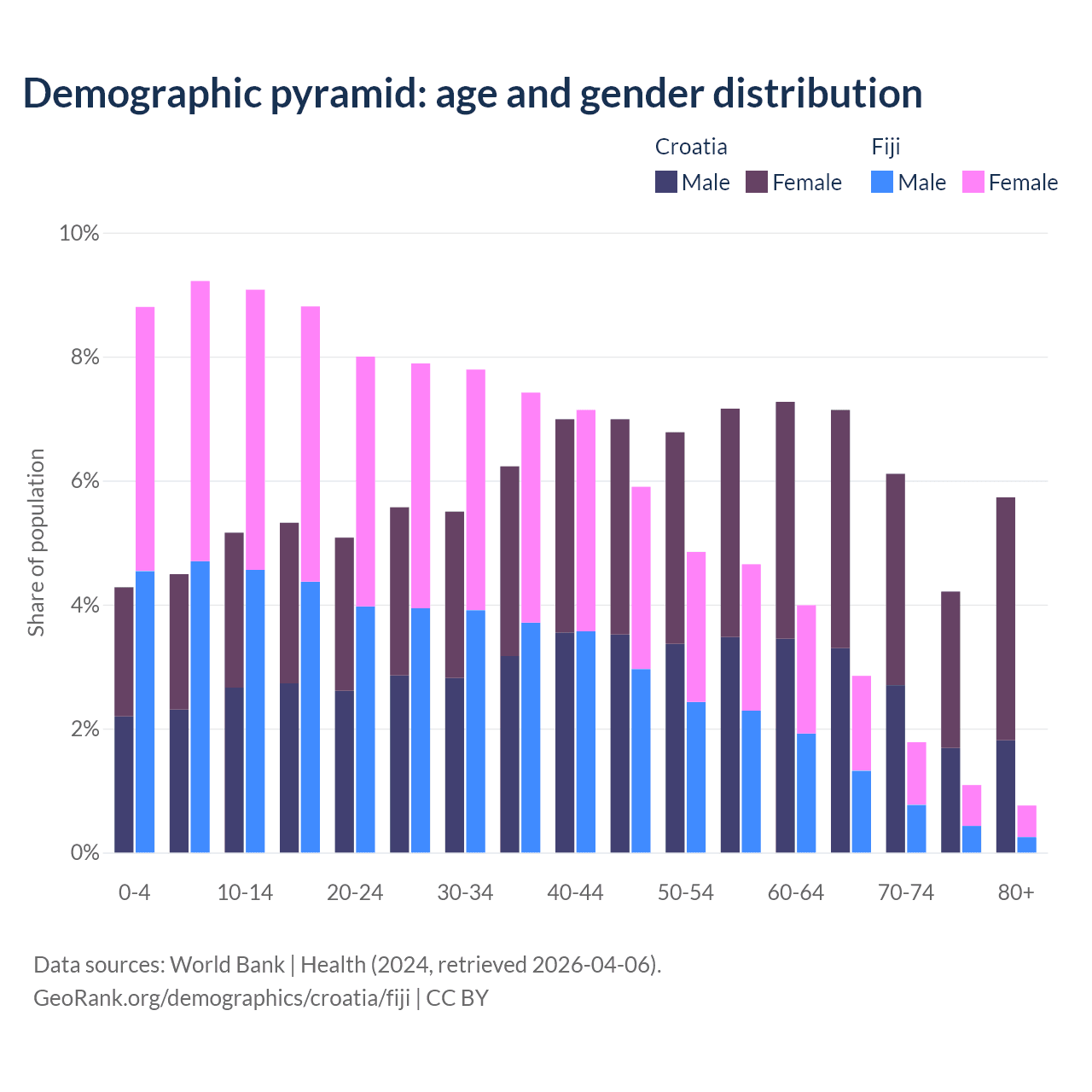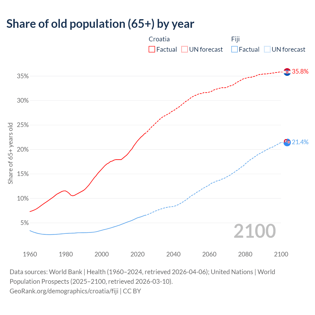 - The share of old-age demographic (65+) in Croatia is 23.2% vs 6.49% in Fiji.