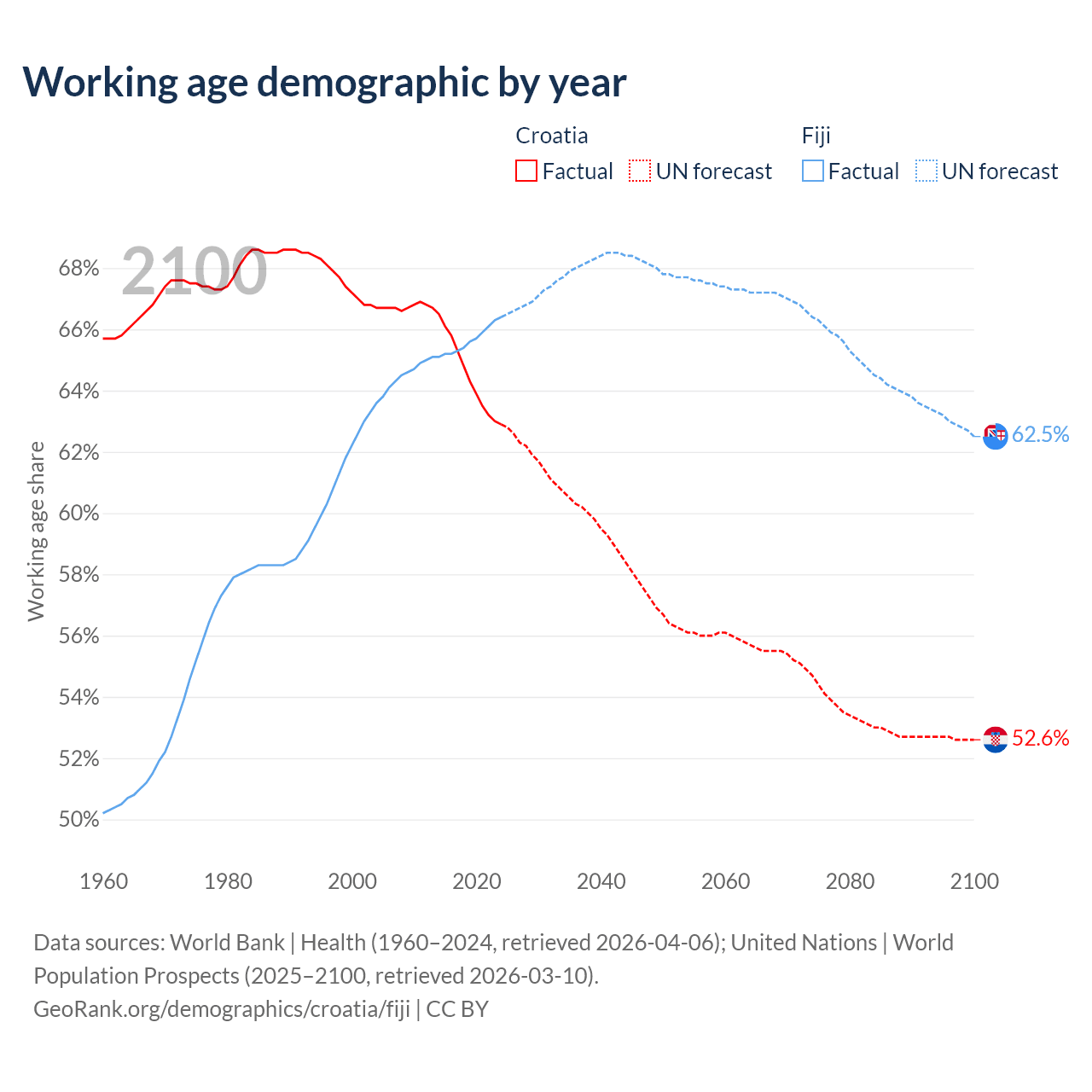 - Croatia has 2.4M working age adults (aged 15-64) vs 623K in Fiji.