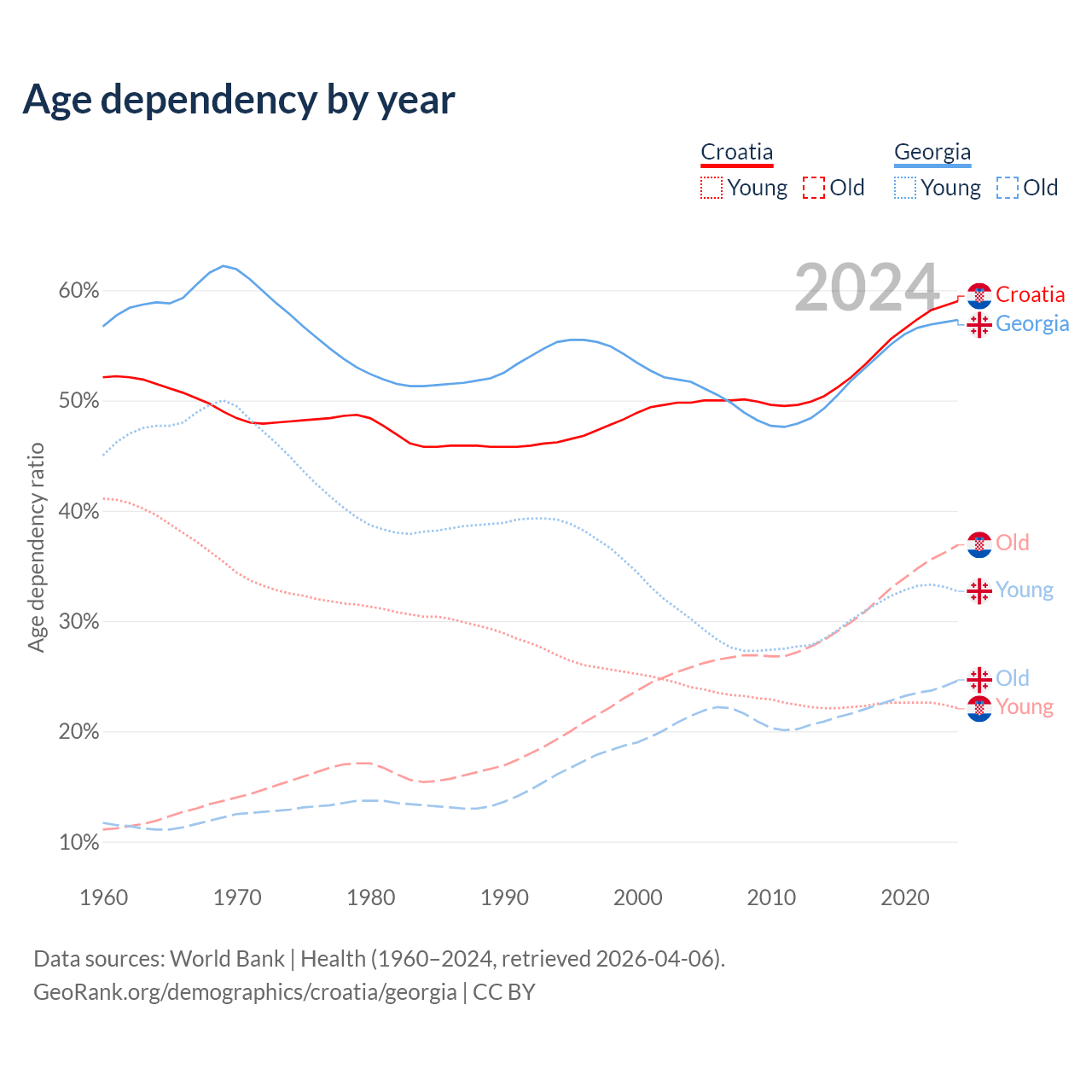 - Croatia is ranked 11/196 by median age (oldest to youngest) vs 59/196 for Georgia.