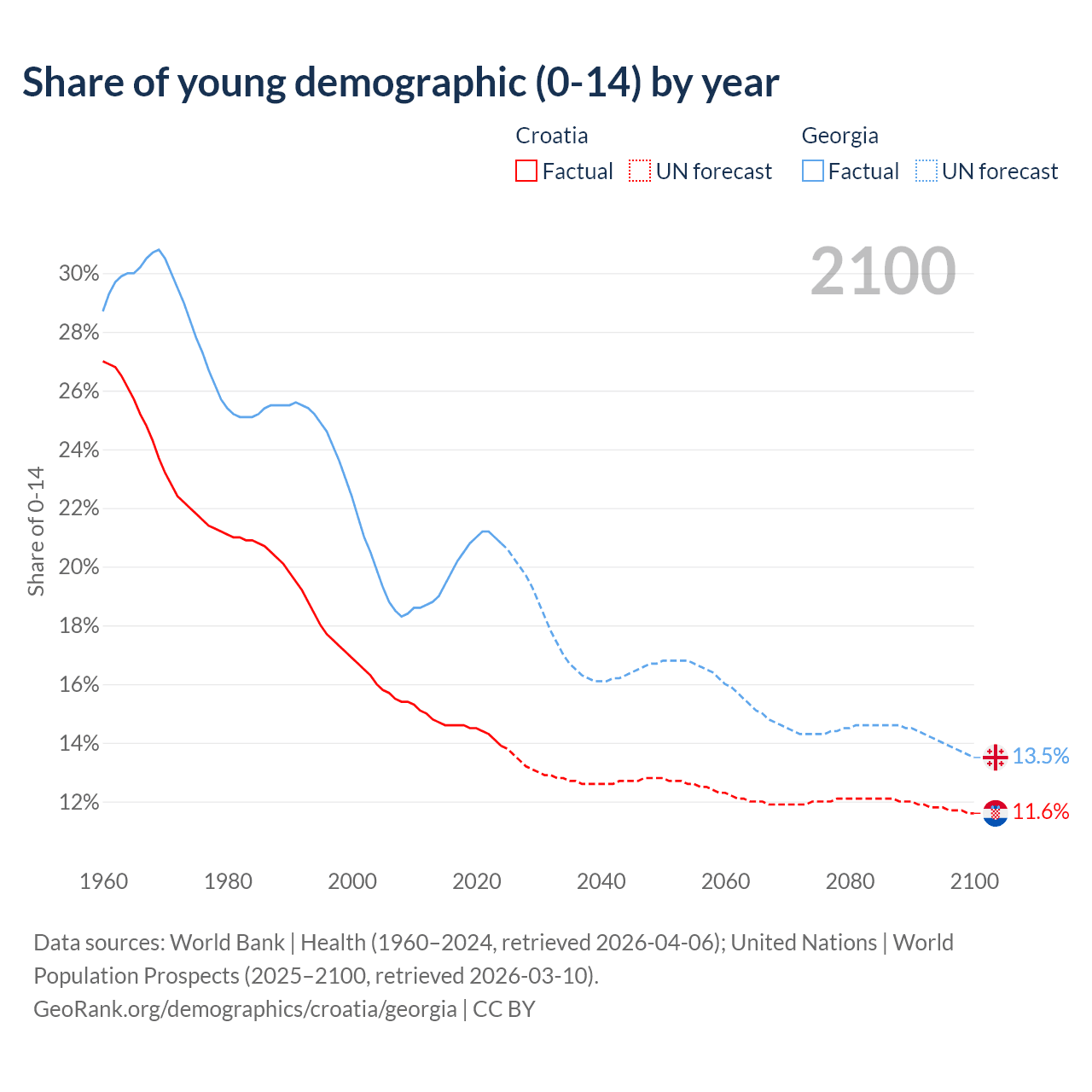 Median age Croatia vs Georgia, 1960-2100