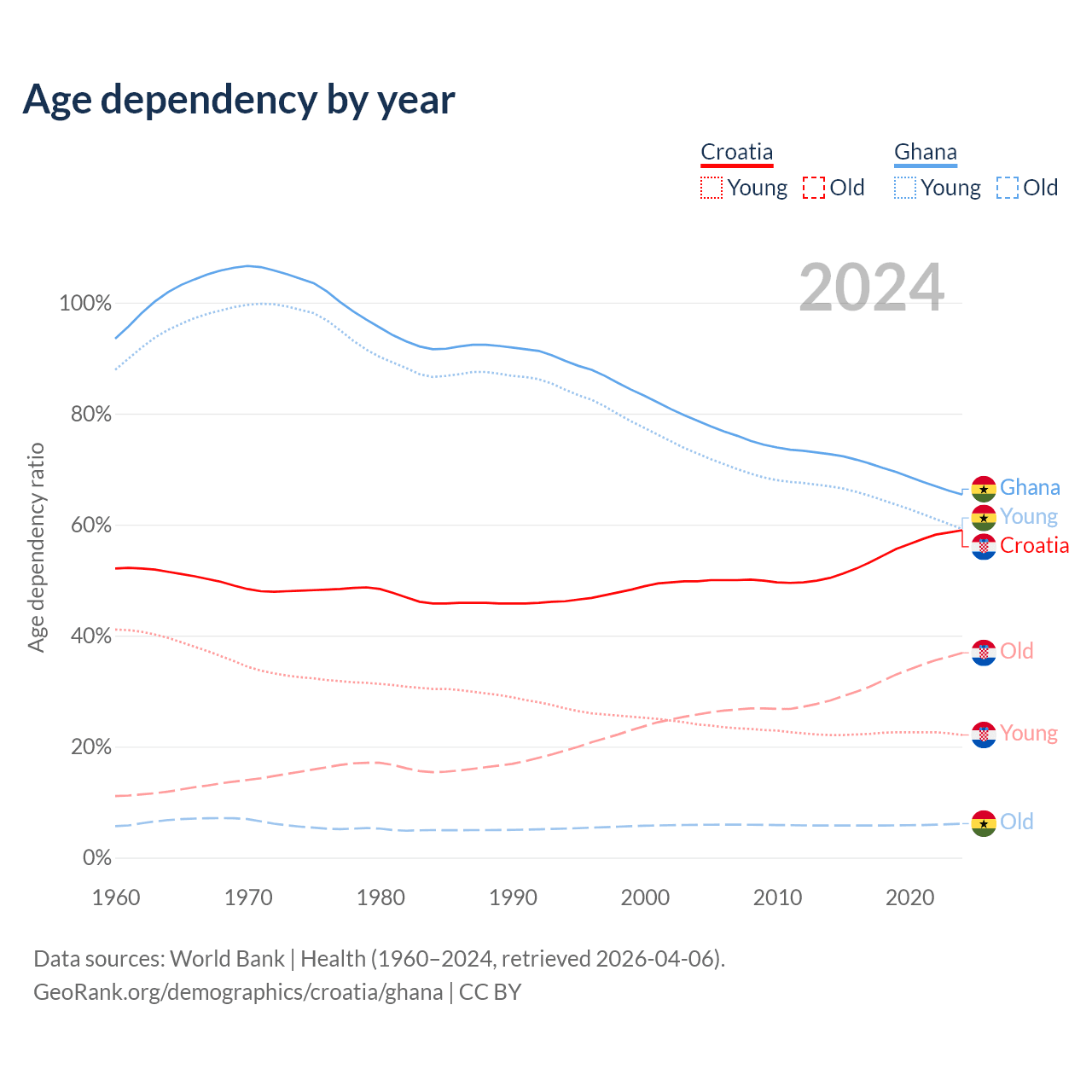 - The share of old-age demographic (65+) in Croatia is 23.2% vs 3.71% in Ghana.