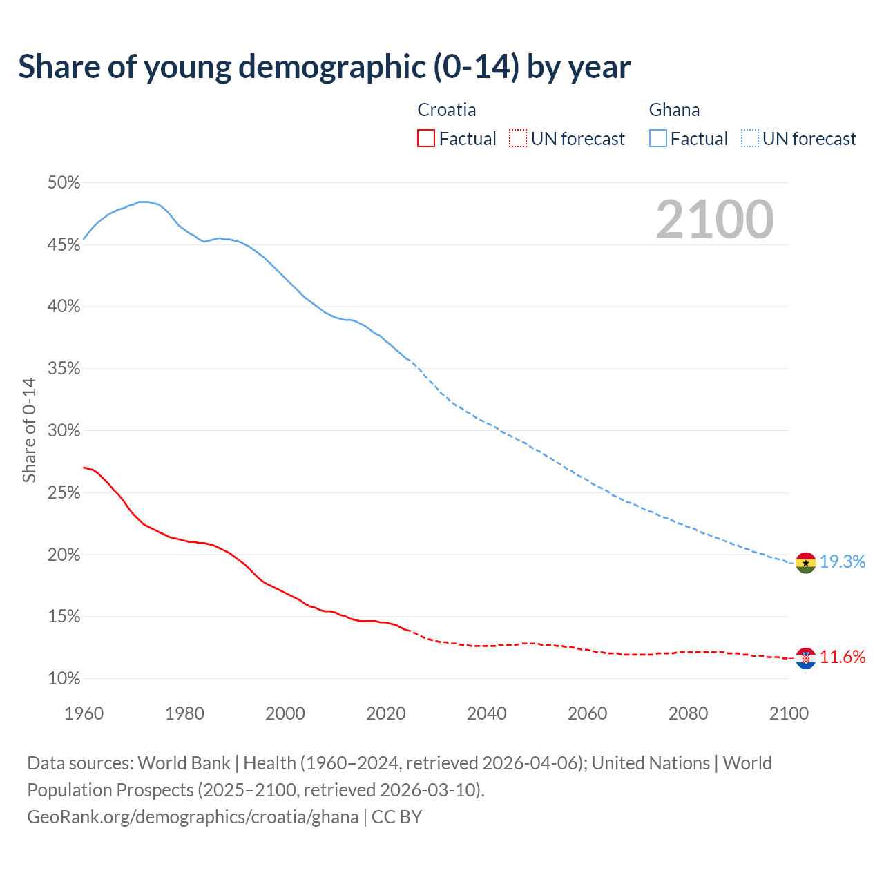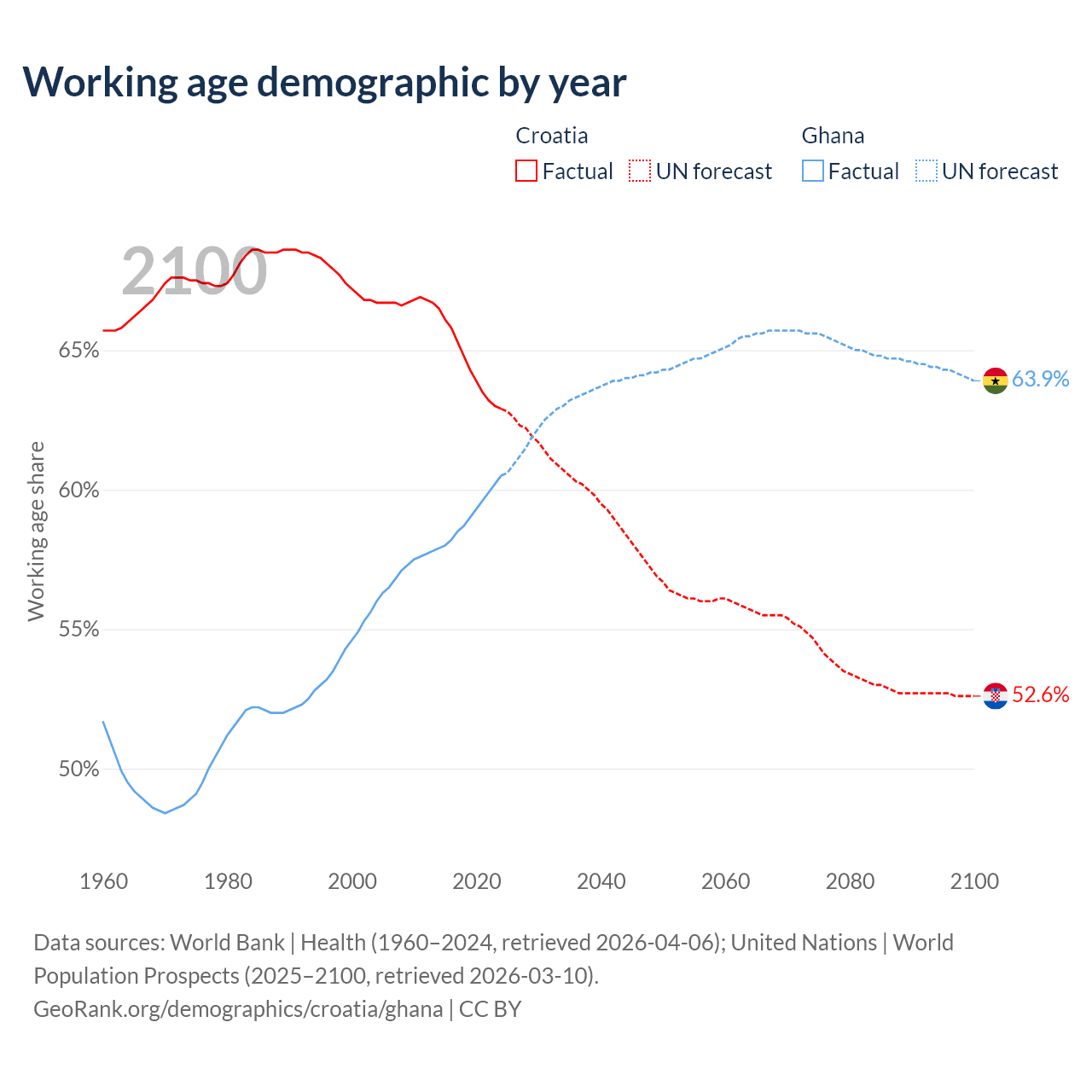 Median age Croatia vs Ghana, 1960-2100