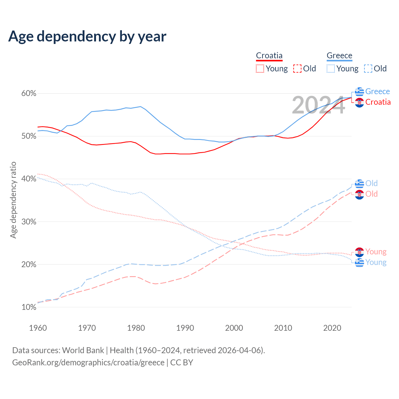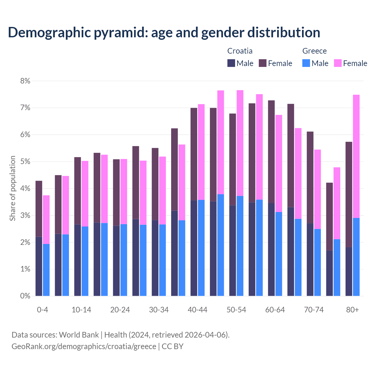 - Croatia is ranked 11/196 by median age (oldest to youngest) vs 6/196 for Greece.