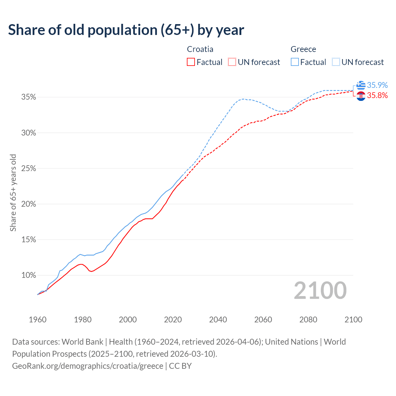 The share of older people aged 65 and over is 23.2% in Croatia and 23.9% in Greece. Life expectancy in Croatia compared to Greece .