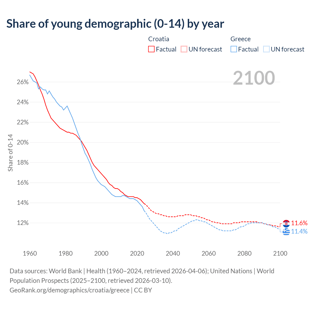 - The share of young demographic (0-15 years old) in Croatia is 13.9% vs 13.2% in Greece.